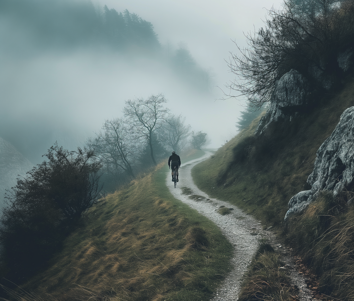 Cyclist rides through a misty, winding path surrounded by rugged terrain and fog, creating a mysterious and adventurous atmosphere.