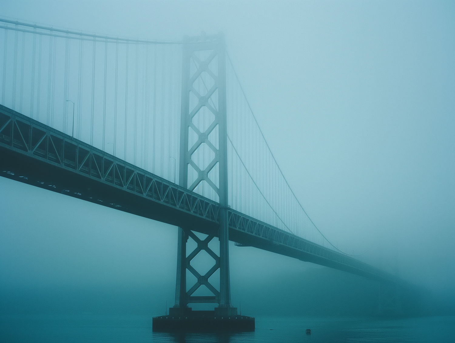 A foggy suspension bridge spans over calm waters, creating a serene and mysterious atmosphere with its bluish tones.