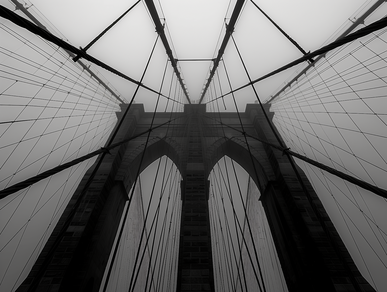 Black and white photo of a suspension bridge with fog, showcasing its architectural beauty and symmetry from a low angle.