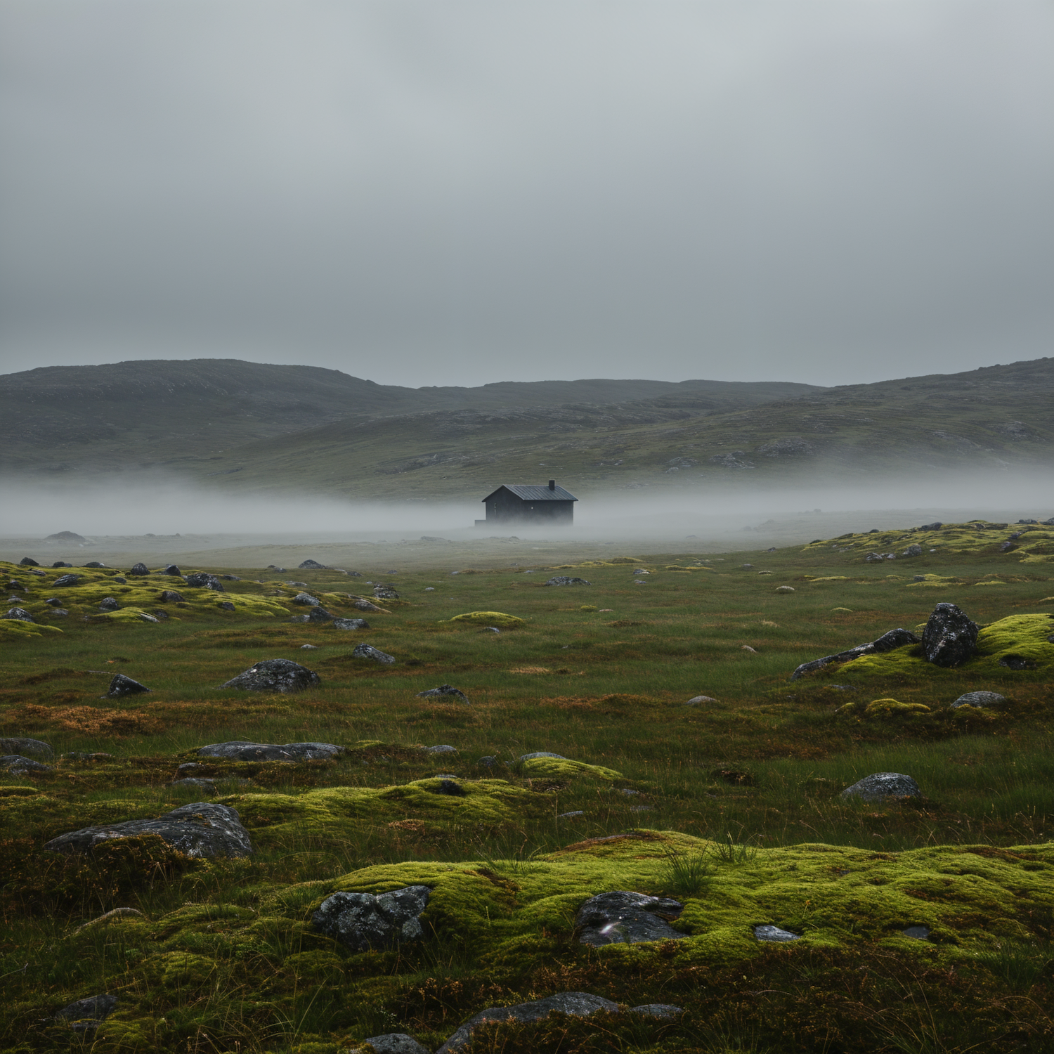A misty field with a lone wooden cabin surrounded by mossy rocks and rolling hills under an overcast sky. Serene and mysterious vibes.