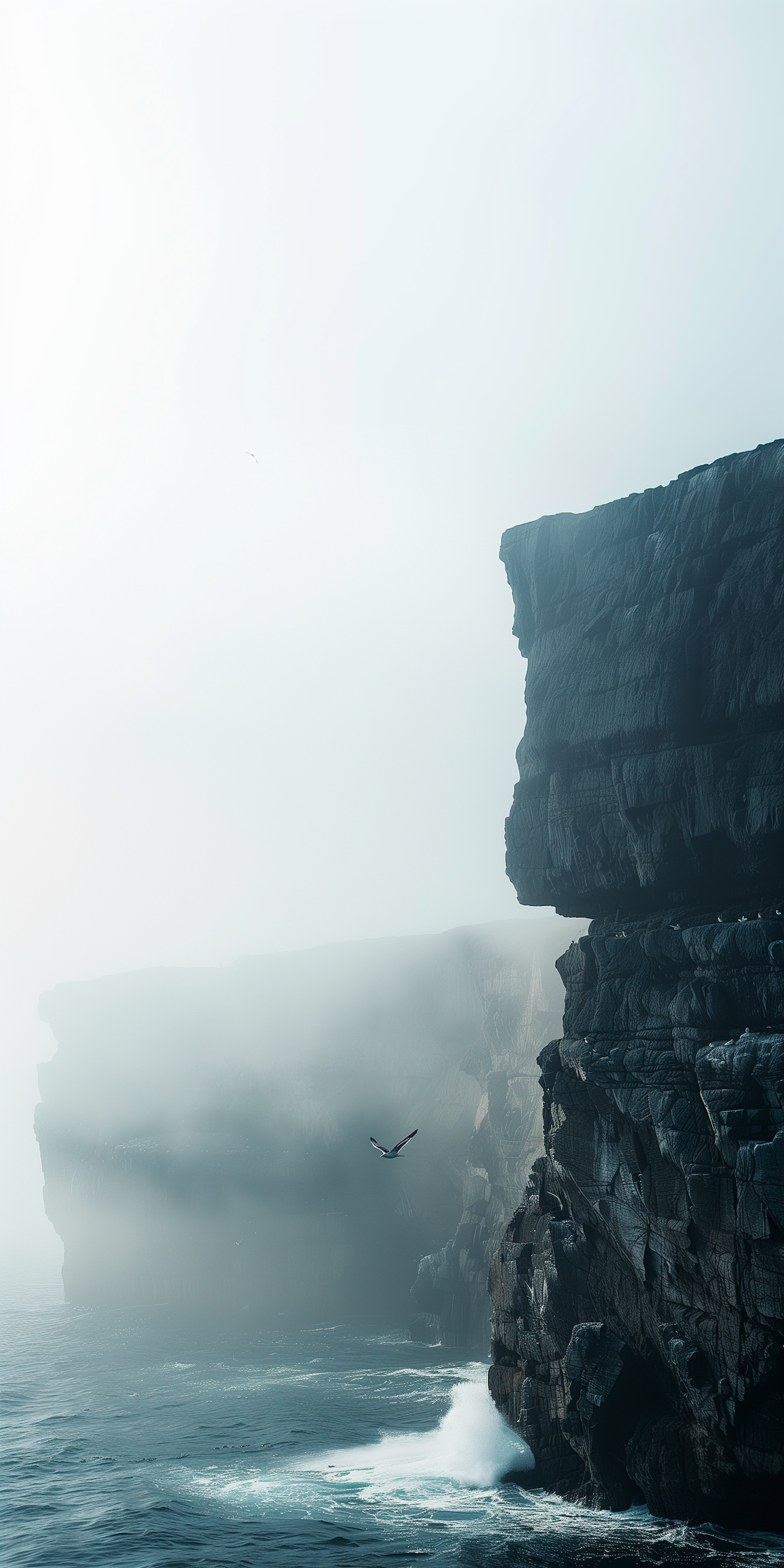 Majestic cliffs rise from a misty ocean, with a bird soaring nearby. Waves crash below, creating a dramatic and serene coastal scene.