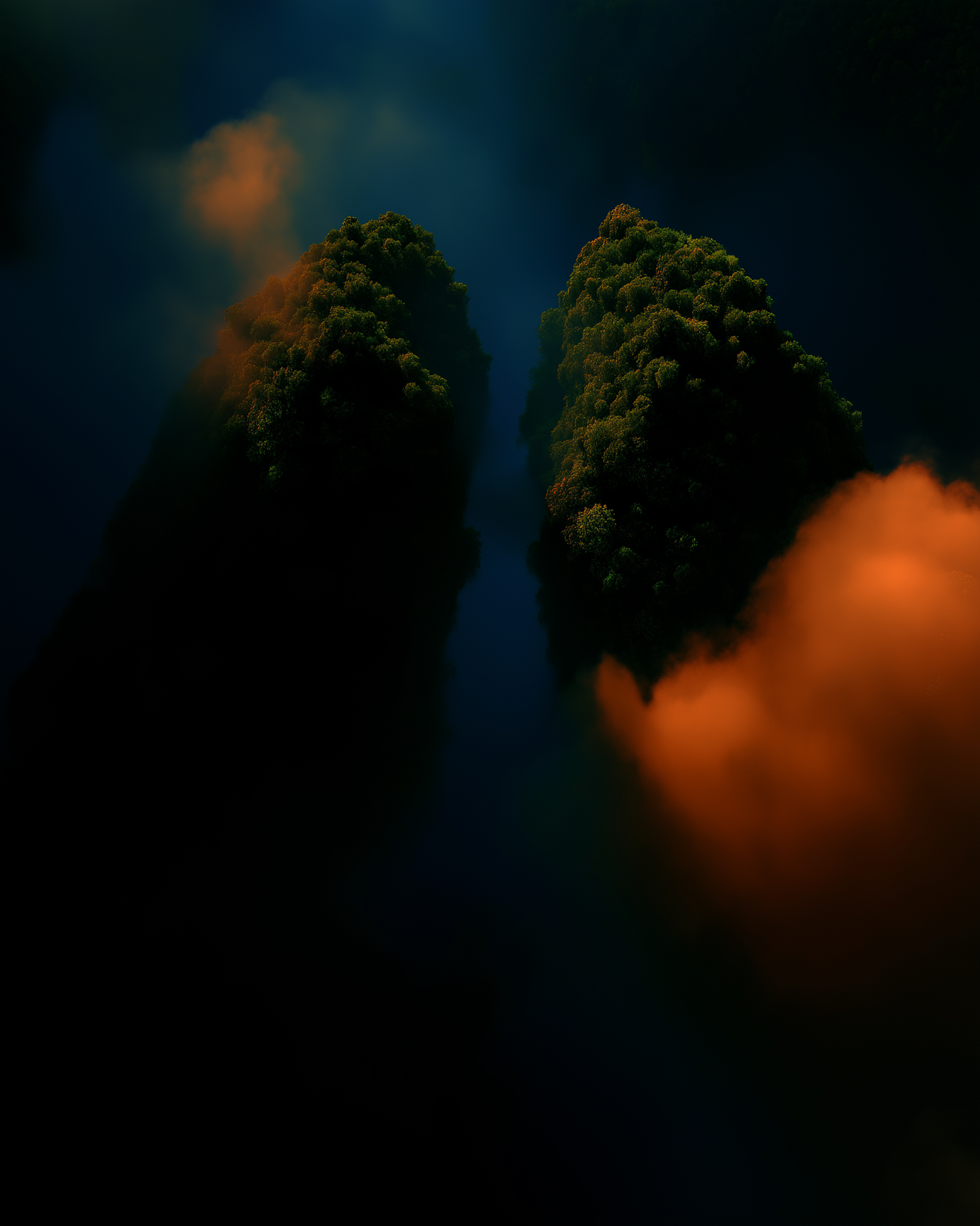 A surreal view of two lush cliffs illuminated by warm orange light against a dark, misty background, creating a dramatic and mysterious scene.