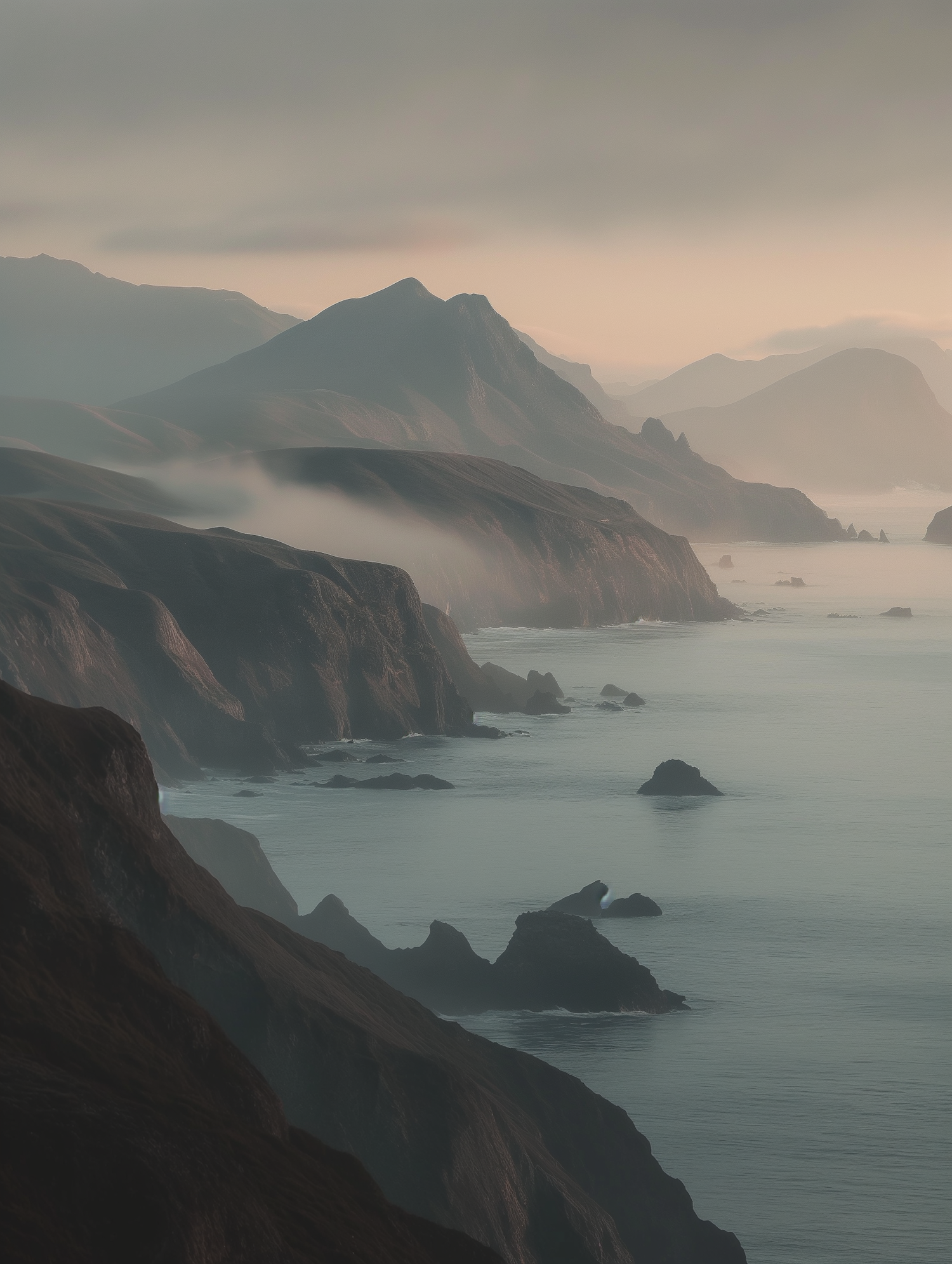 Serene coastal landscape with rugged cliffs, misty atmosphere, and calm ocean waves under a soft, muted light.