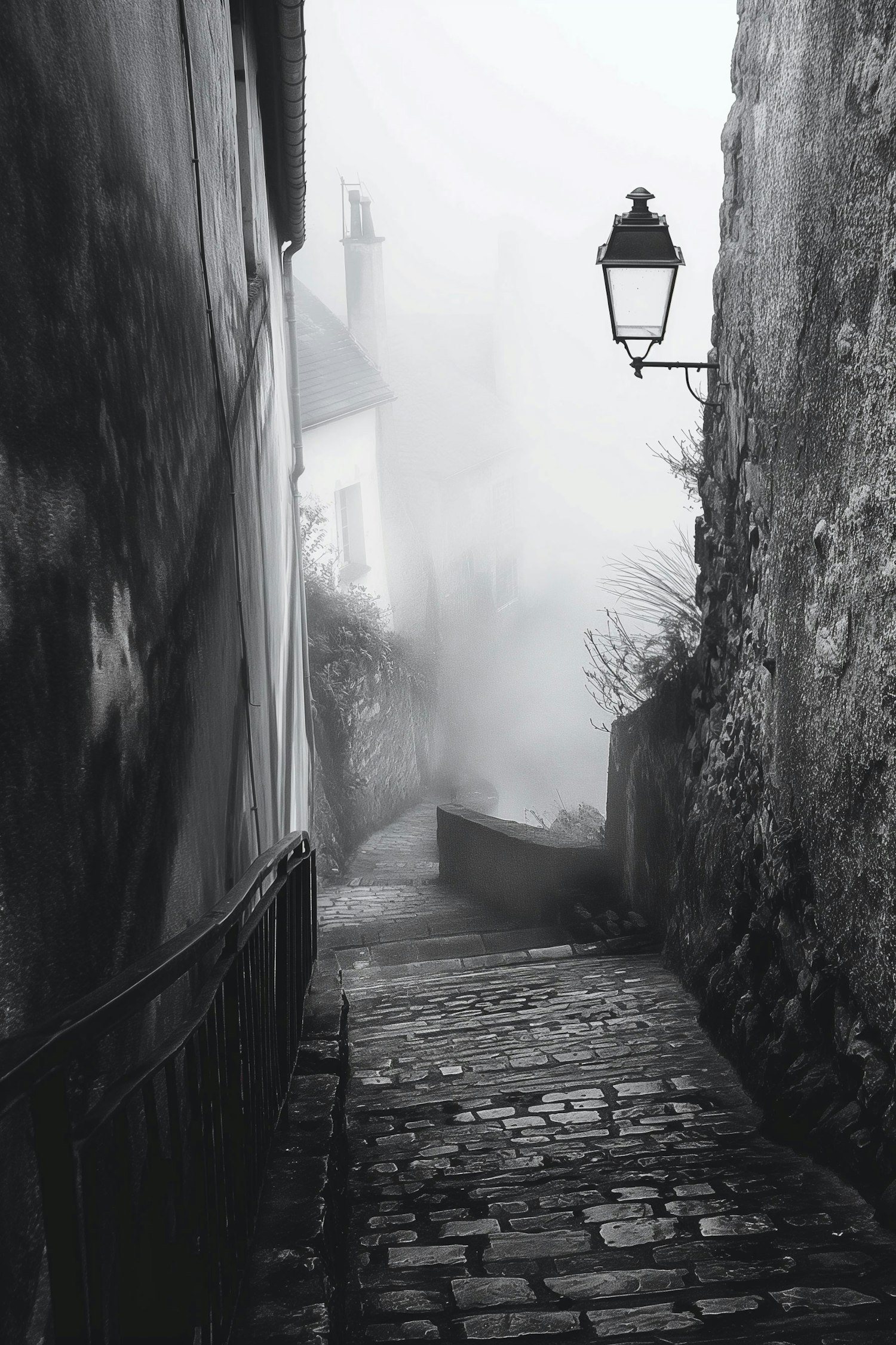 Mysterious foggy alleyway with cobblestones and vintage street lamp, creating an atmospheric and timeless scene.