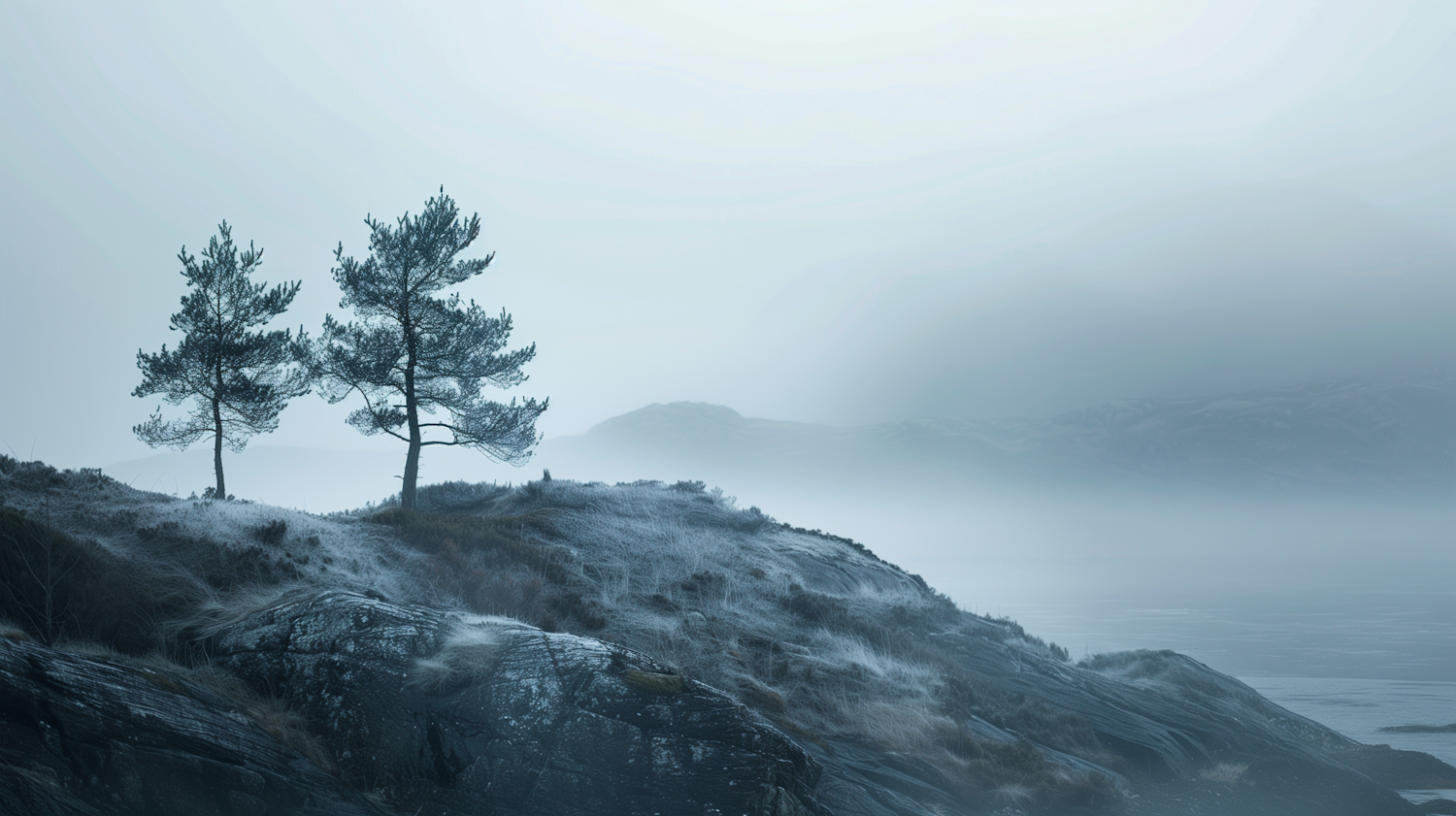 Frosty hill with two pine trees in a misty, serene landscape. Ethereal blue tones and rugged textures create a tranquil, wintry scene.