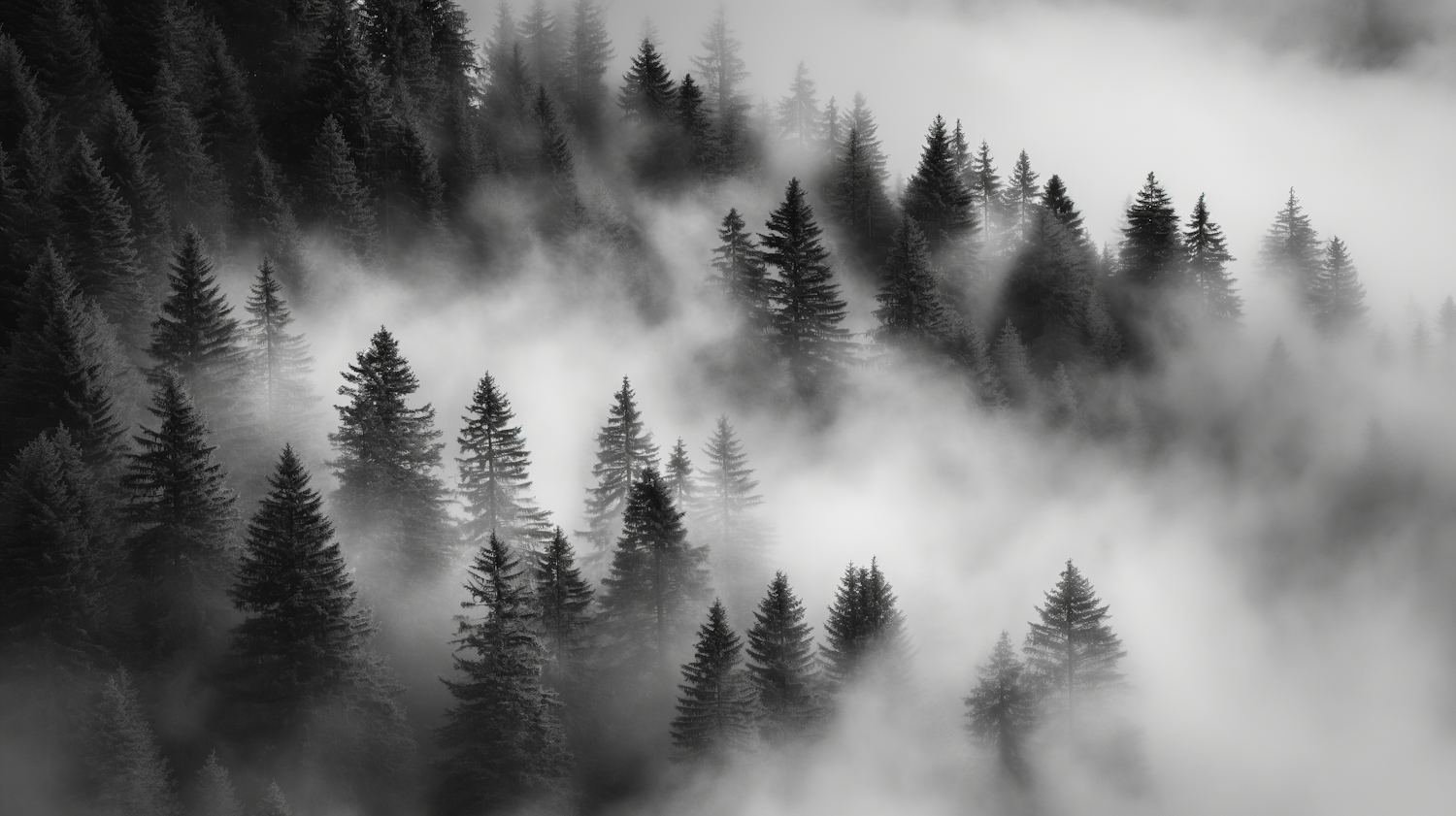Misty evergreen forest with swirling fog creating a mysterious and serene atmosphere in monochrome shades.