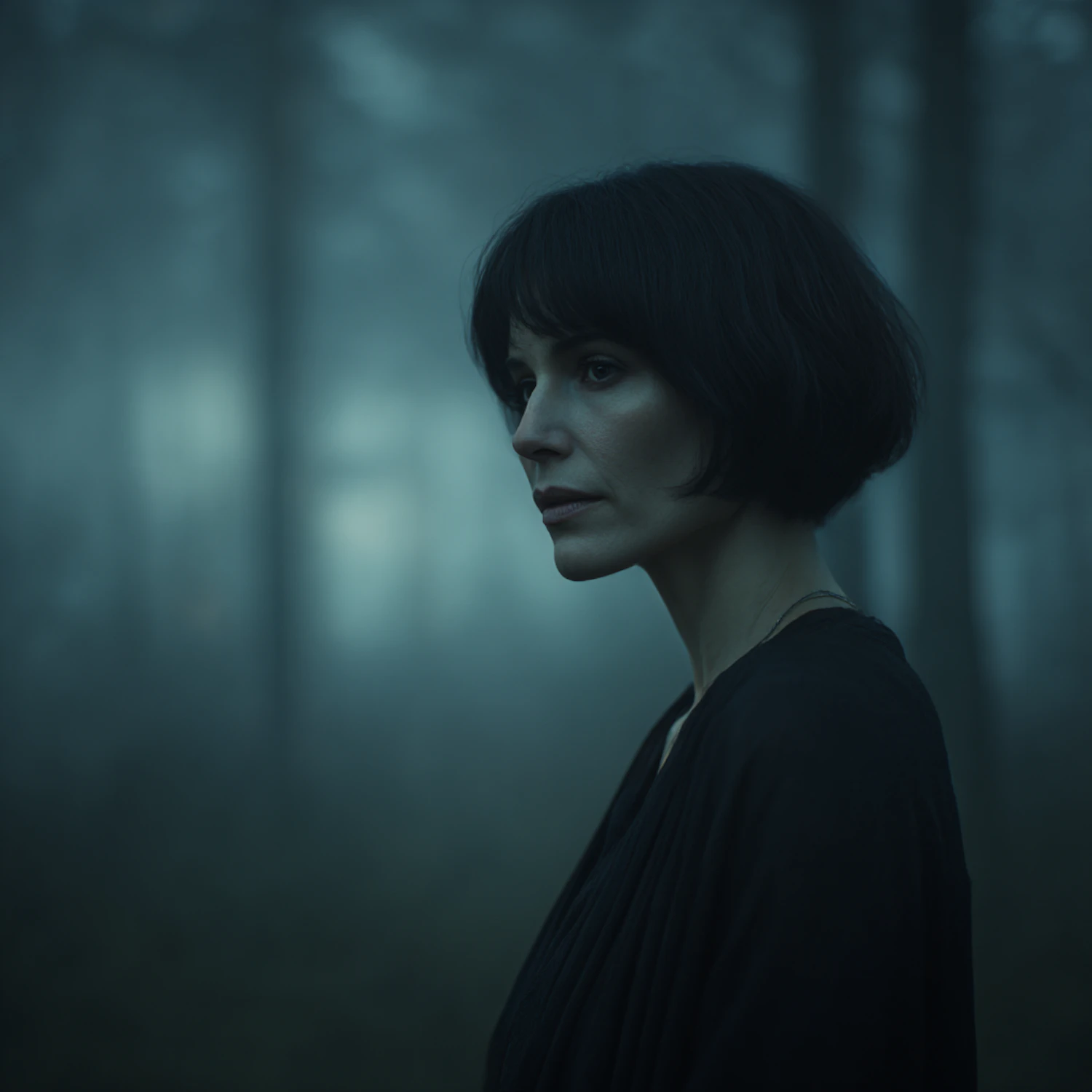 A contemplative woman in a misty forest, her dark attire blending with the moody, foggy atmosphere.