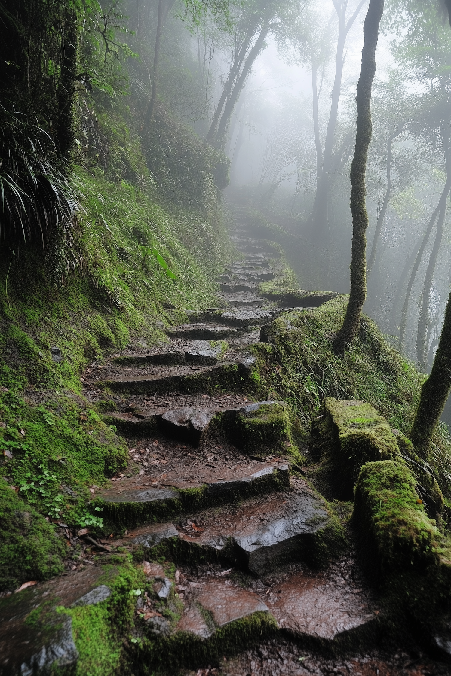Misty forest path with moss-covered stone steps, surrounded by lush greenery and fog, creating a serene and mystical atmosphere.