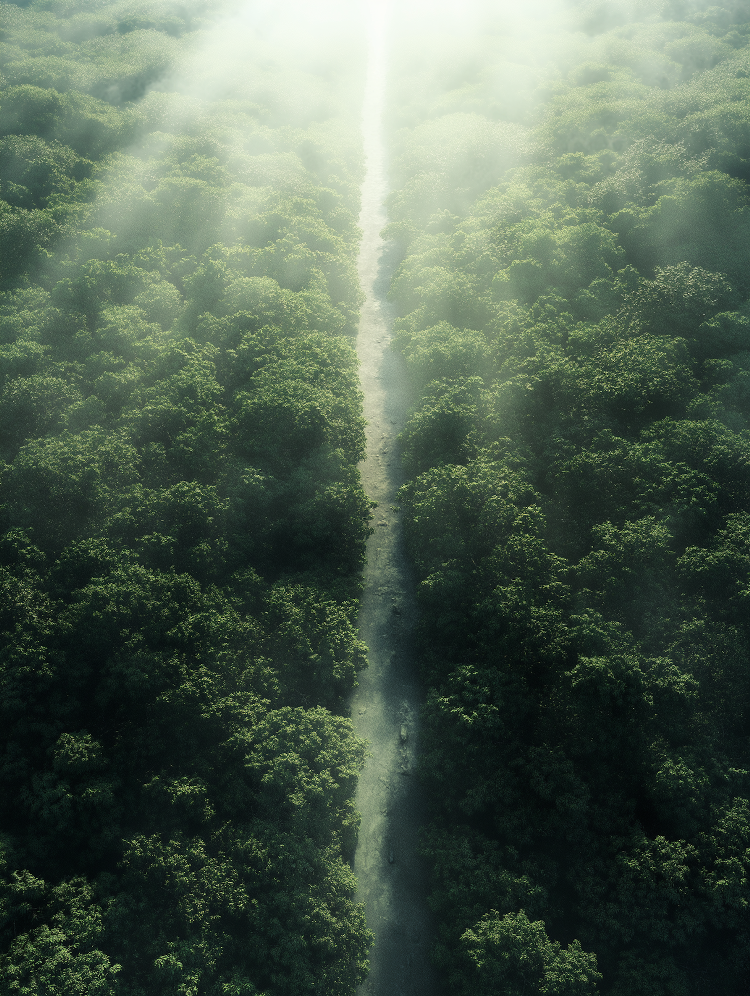 Aerial view of a lush forest with a misty path cutting through, bathed in soft sunlight, creating a serene and mysterious atmosphere.