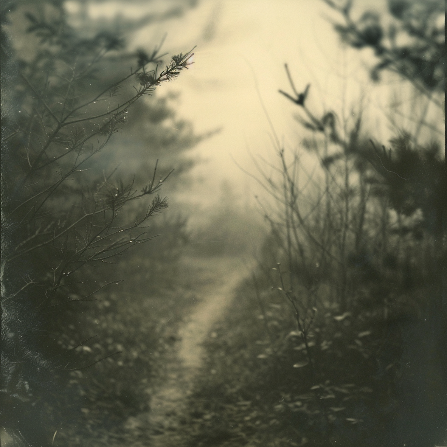 A misty forest path enveloped in fog, creating a mysterious and serene atmosphere with soft, monochromatic tones.