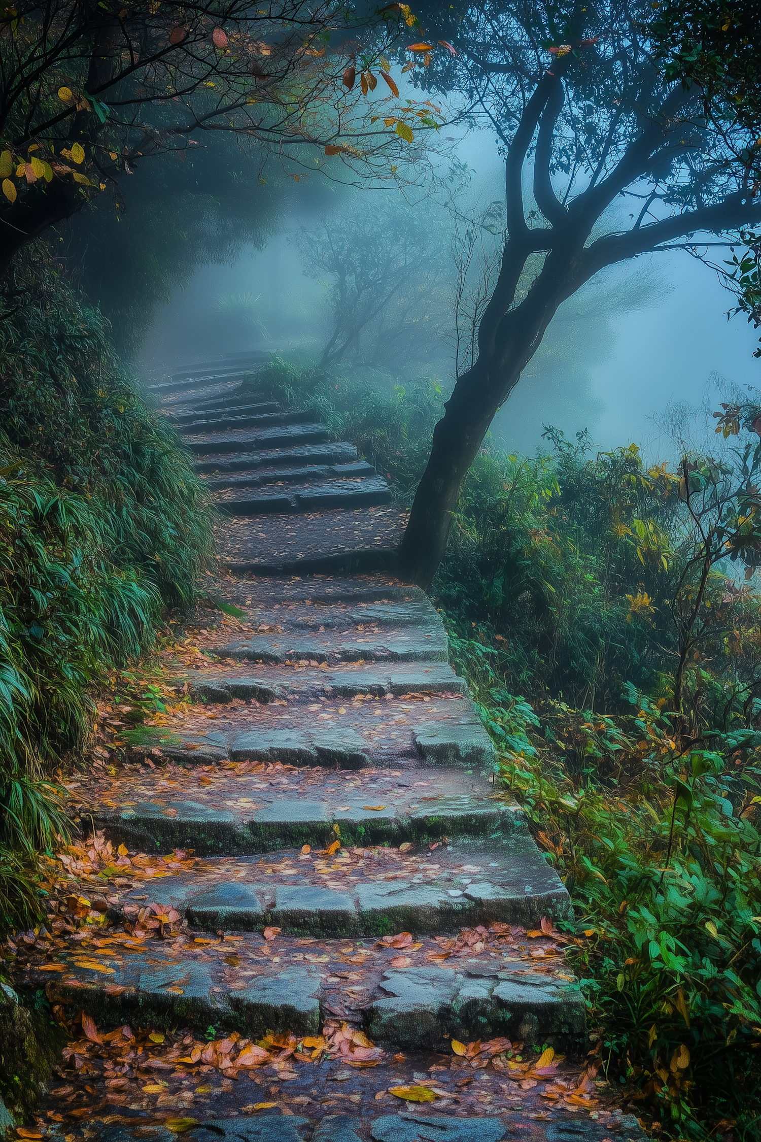 Misty stone pathway in a lush forest, lined with autumn leaves and surrounded by vibrant greenery, creating a serene and mystical atmosphere.
