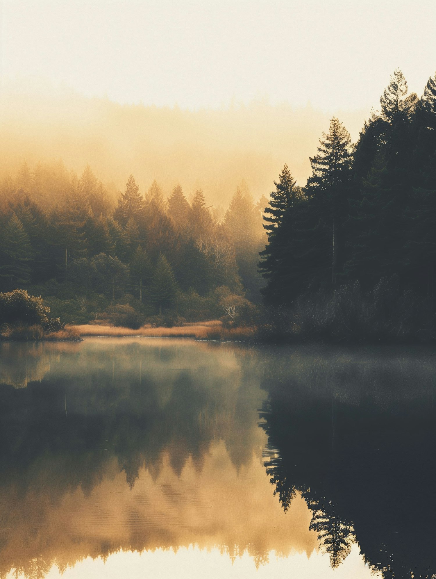 Golden-hued forest reflected in a tranquil lake, with misty, ethereal light creating a serene and dreamy atmosphere.