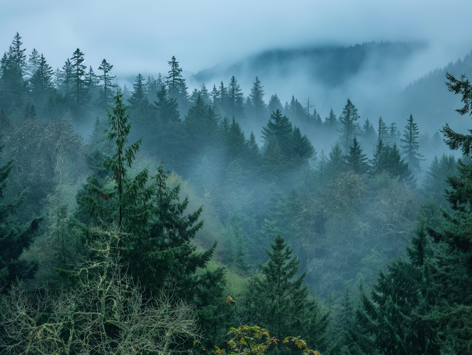 Misty forest with tall evergreens and a serene, mystical atmosphere. Overcast sky adds depth and mystery to the lush green landscape.