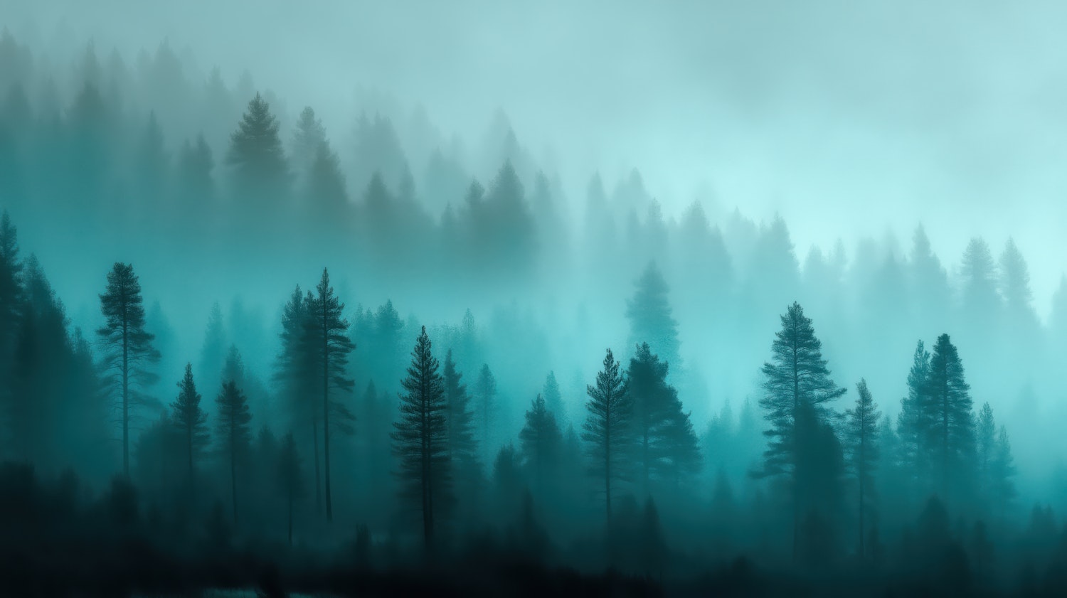 A misty forest with tall pine trees silhouetted against teal and blue hues, creating a tranquil and mysterious atmosphere.