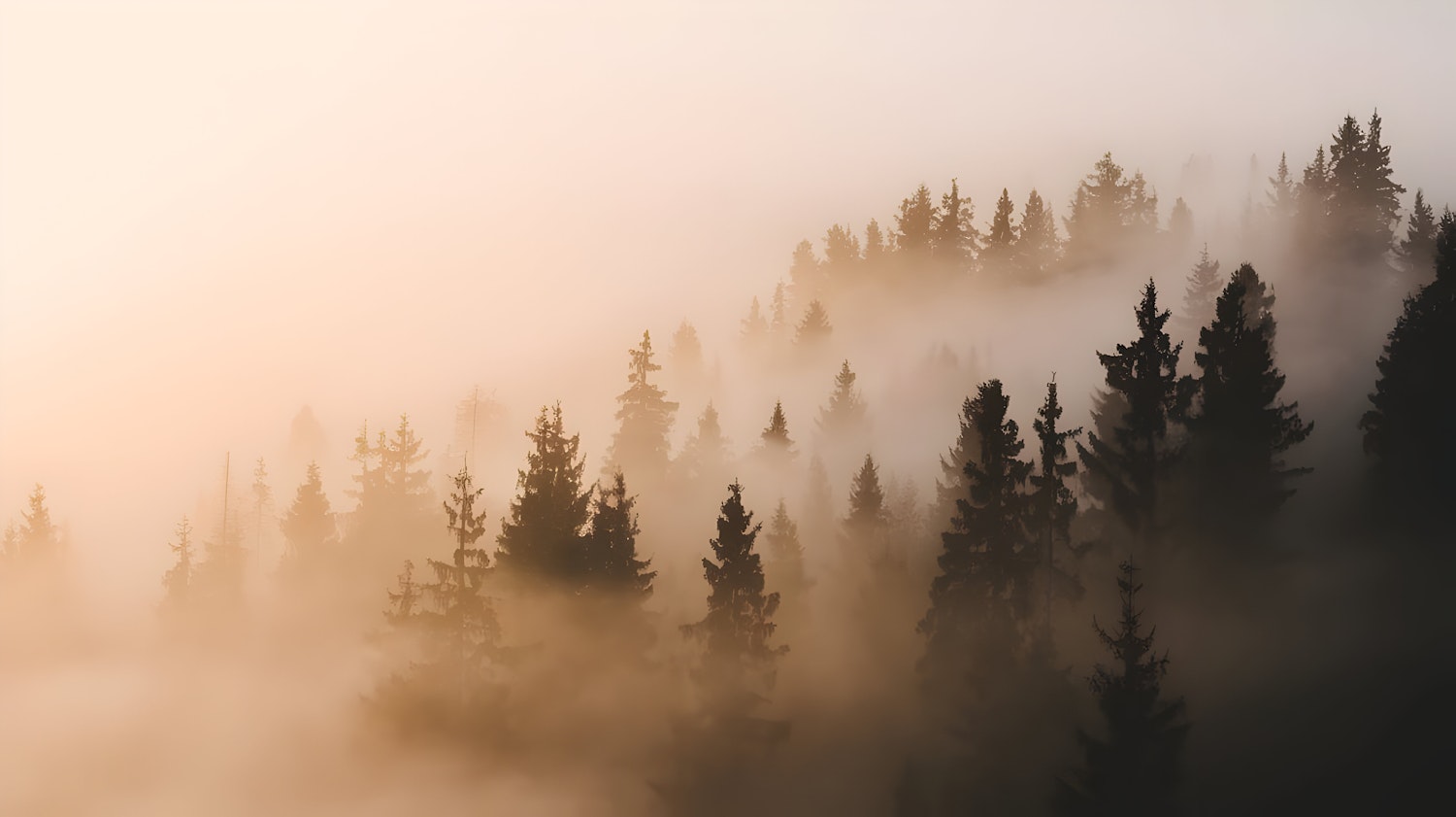 Misty forest at sunrise or sunset with golden light filtering through tall evergreen trees, creating a serene and ethereal atmosphere.