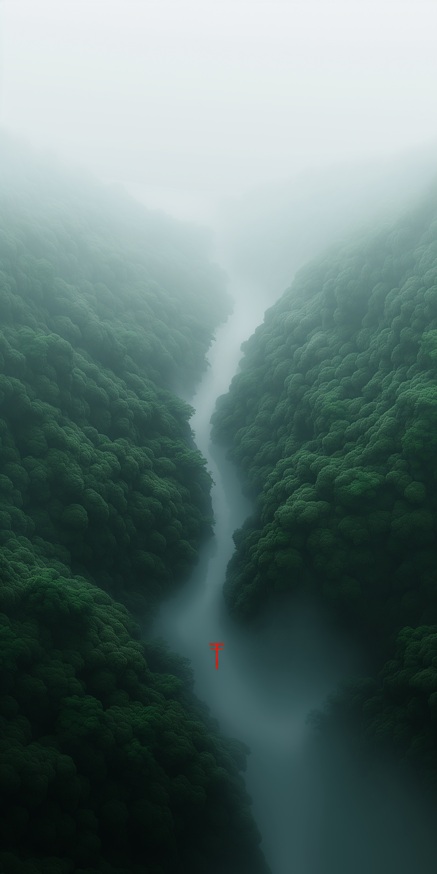 Misty green hills with a winding path and a striking red torii gate, creating a serene and mystical landscape.