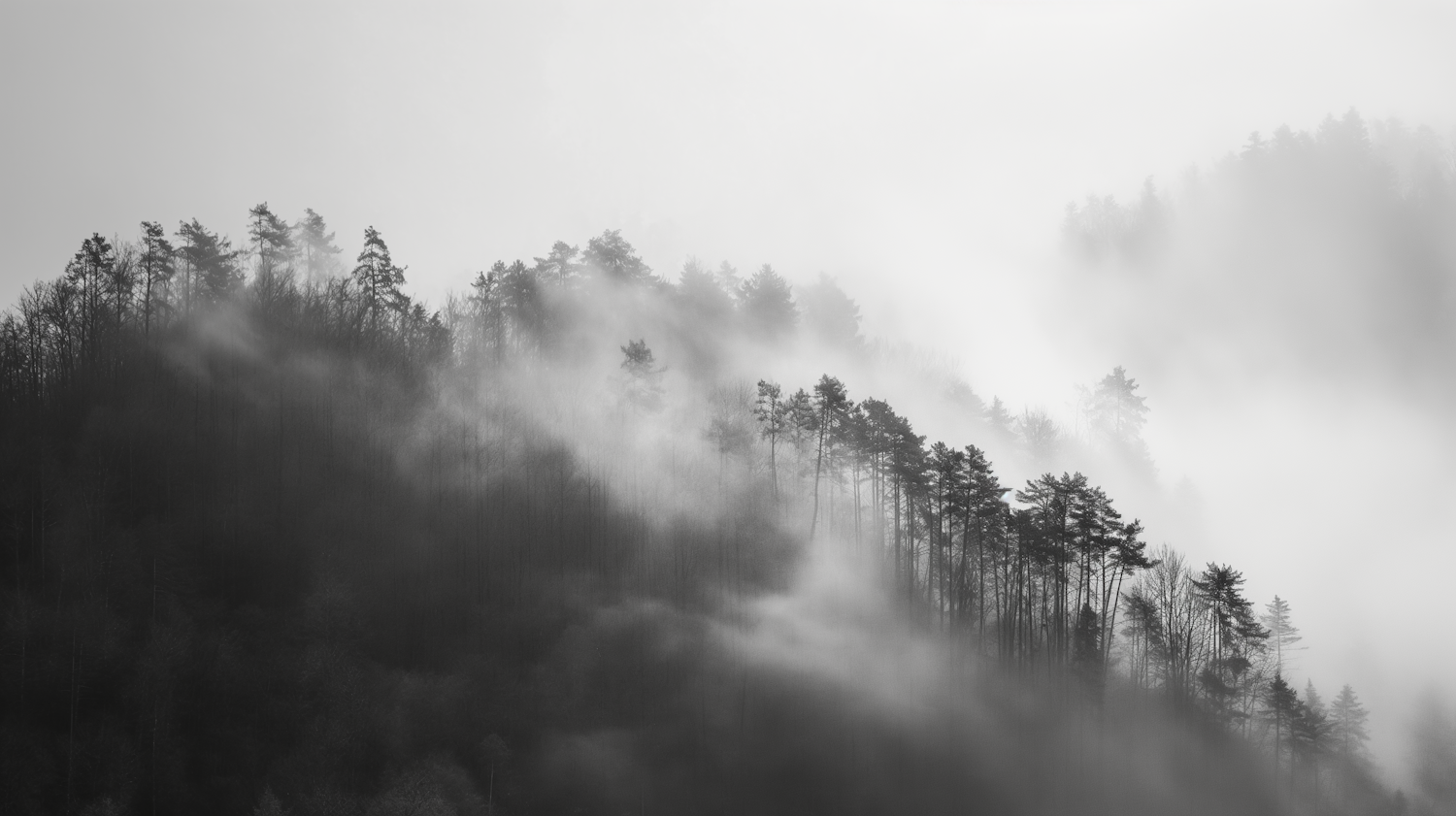 Misty forest landscape with silhouetted trees and swirling fog, creating a serene and mysterious atmosphere in grayscale tones.