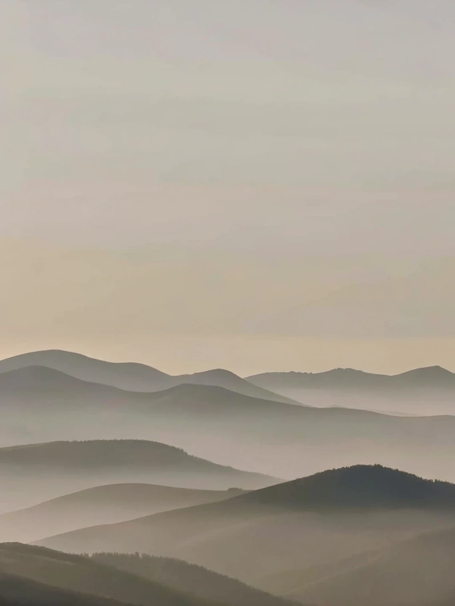 Dreamy layers of misty hills and mountains fading into a soft, pale sky. A tranquil and minimalistic nature scene.