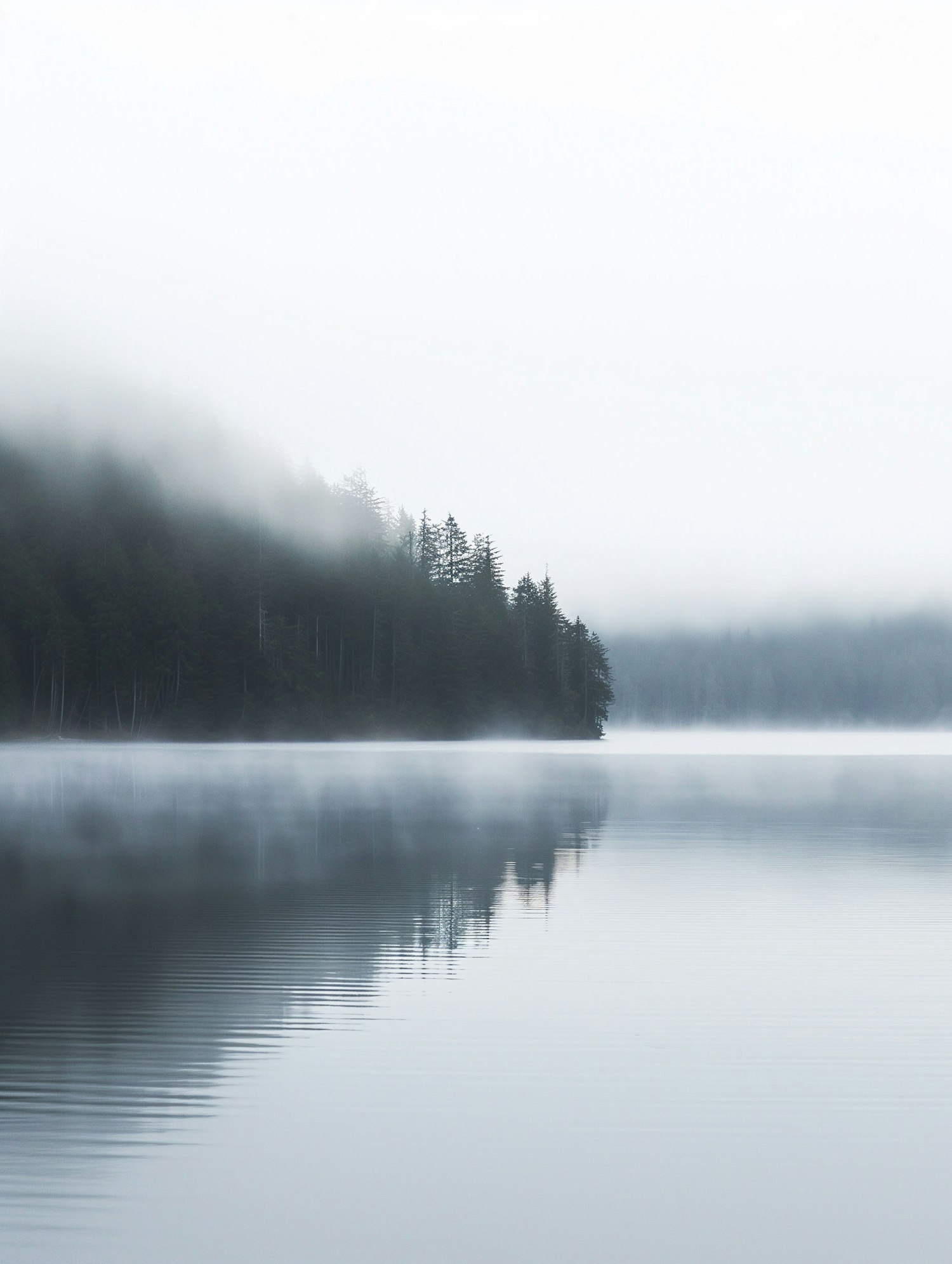 Misty lake with calm waters and a foggy forest shoreline, creating a serene and ethereal atmosphere.