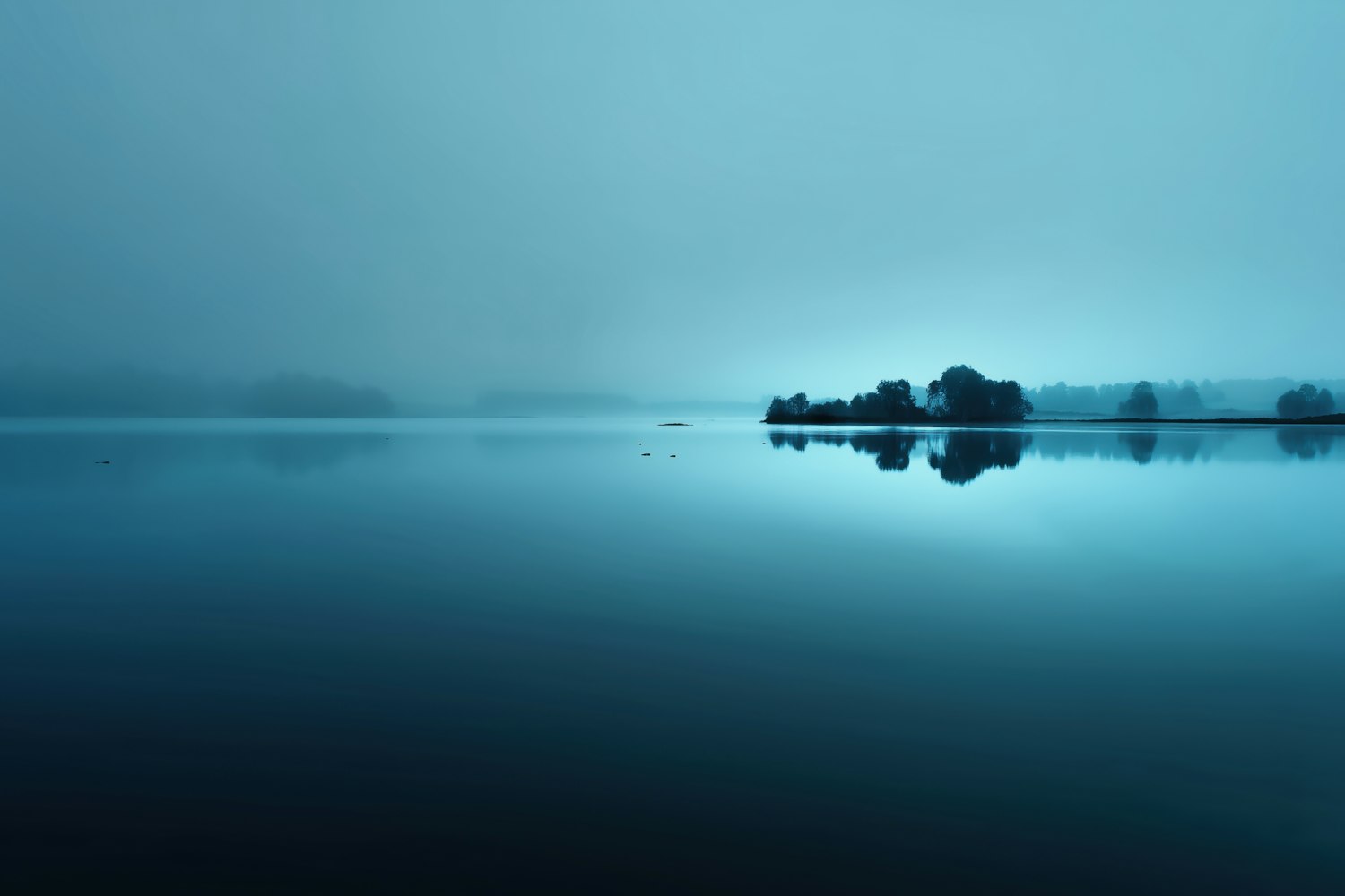 A tranquil misty lake with calm waters reflecting trees and a small island, all in soothing shades of blue.