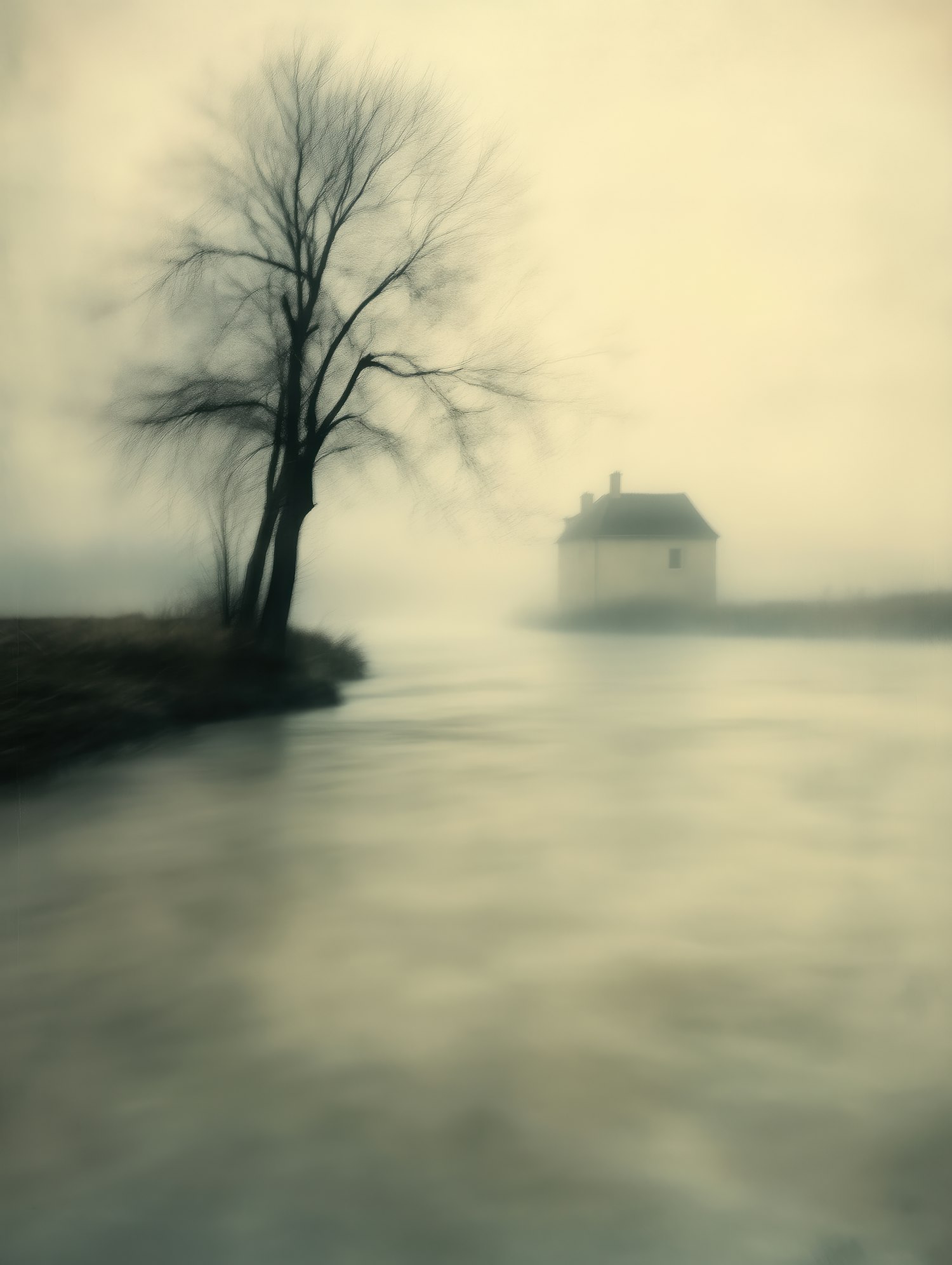 A foggy landscape with a solitary tree, a small house, and a flowing river, creating a serene and mysterious atmosphere.