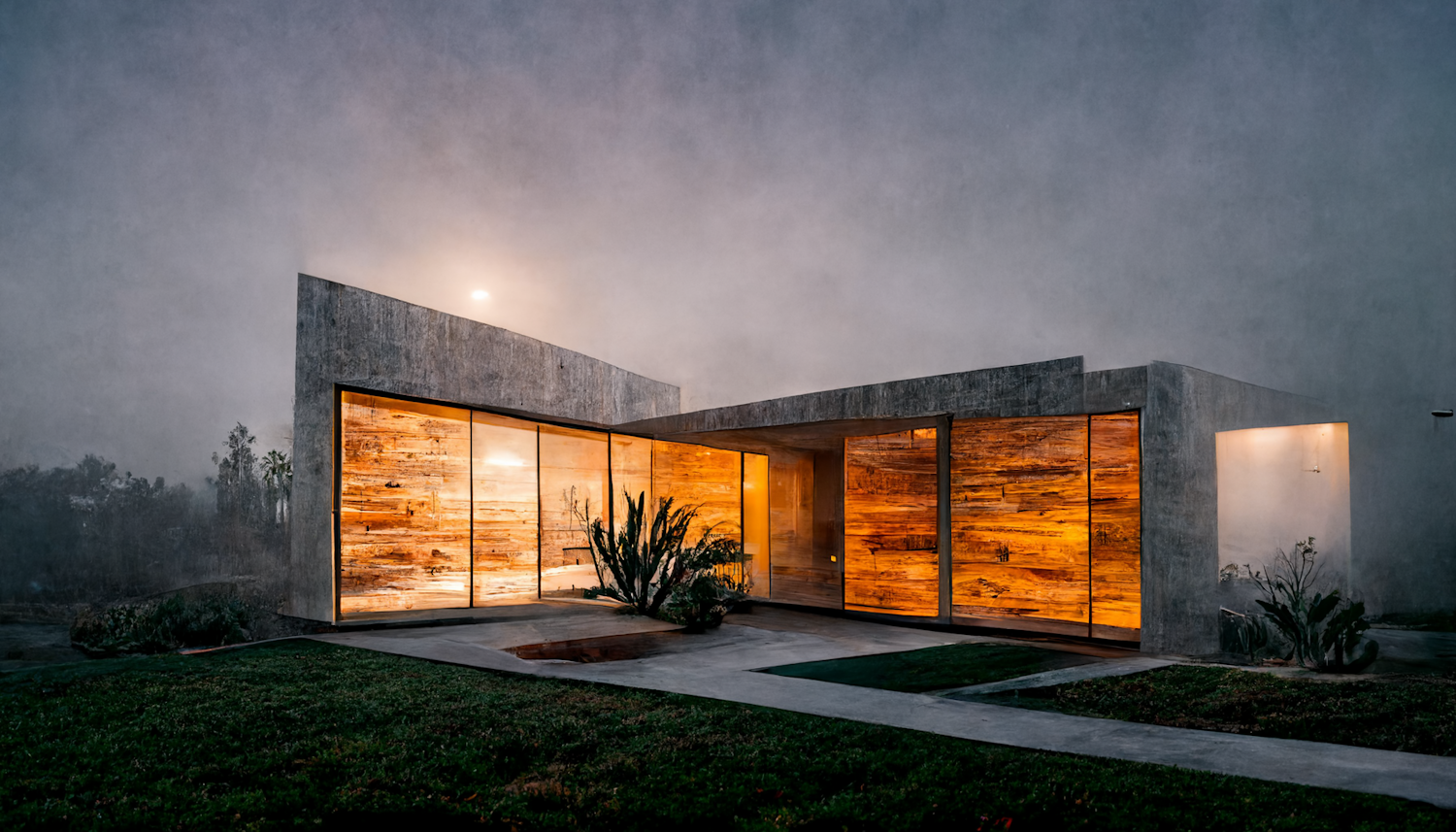 Modern house with warm interior lighting, sleek concrete design, and large glass panels in a misty, serene setting.