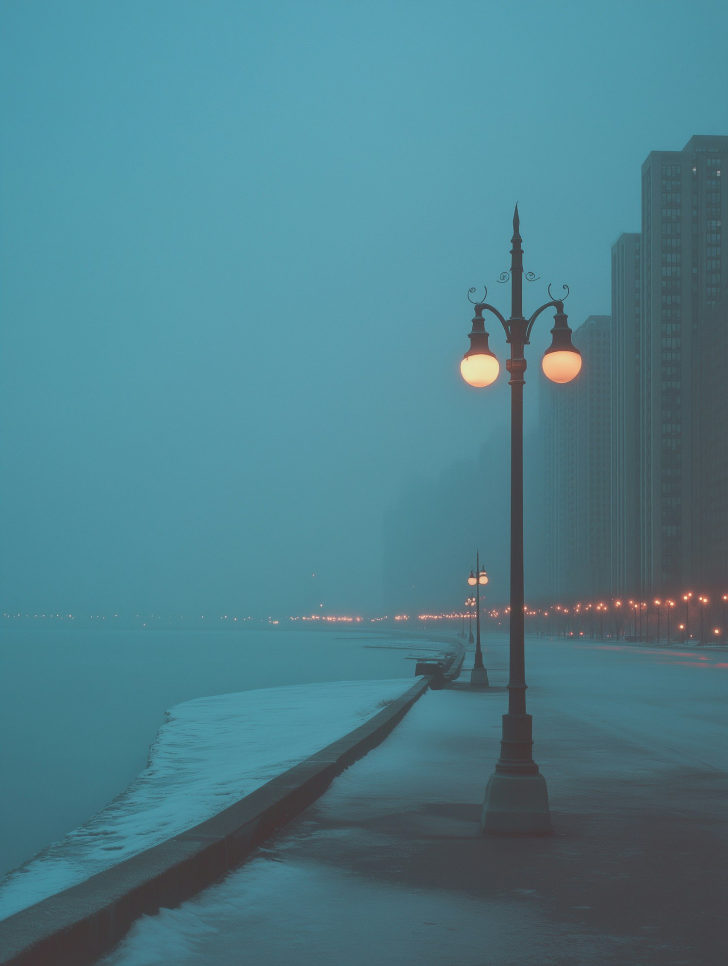 Misty waterfront with vintage street lamps and snow-dusted promenade, set against a backdrop of shadowy skyscrapers.
