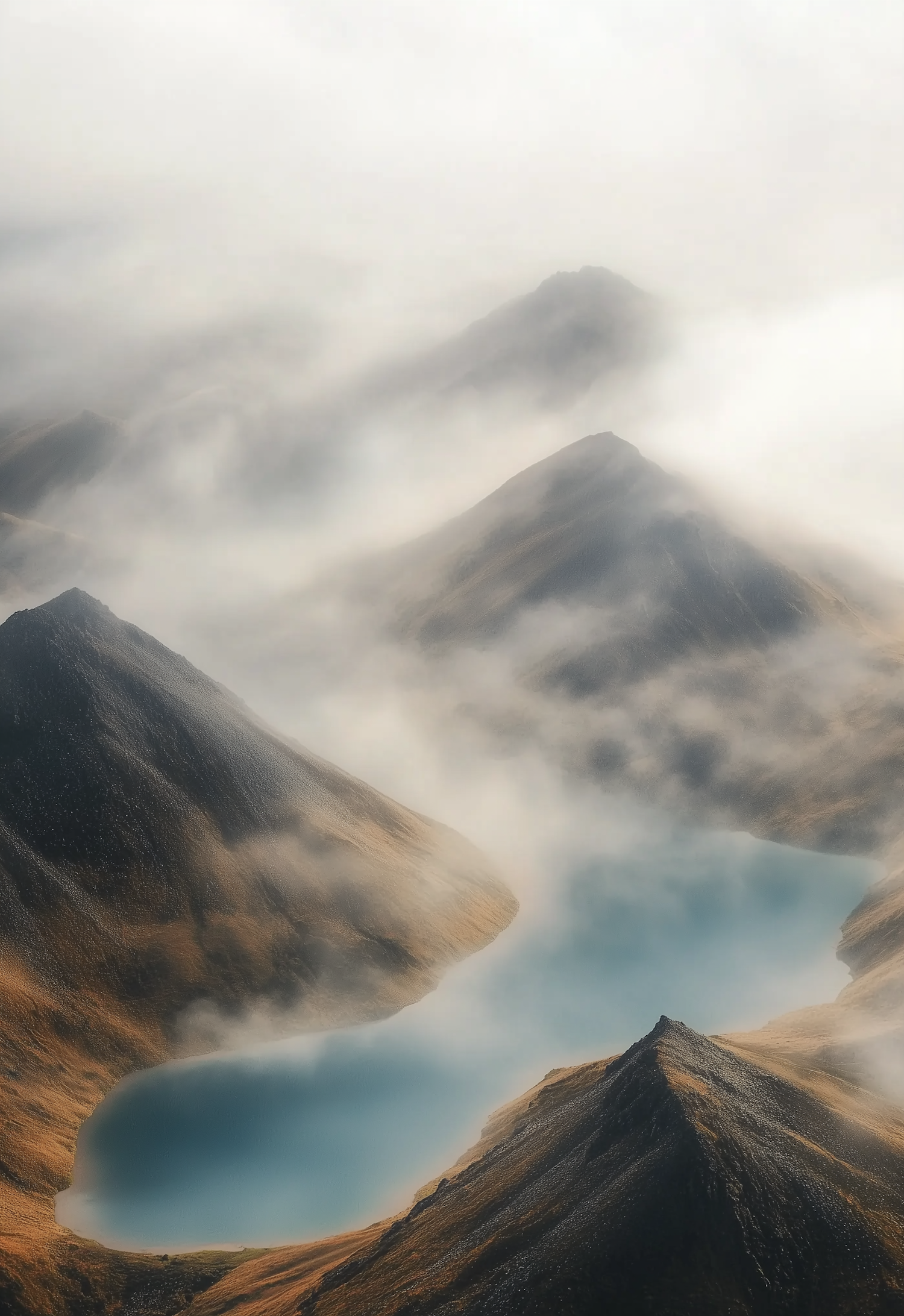 A misty mountain landscape with a serene blue lake surrounded by rugged peaks, creating a tranquil and ethereal atmosphere.