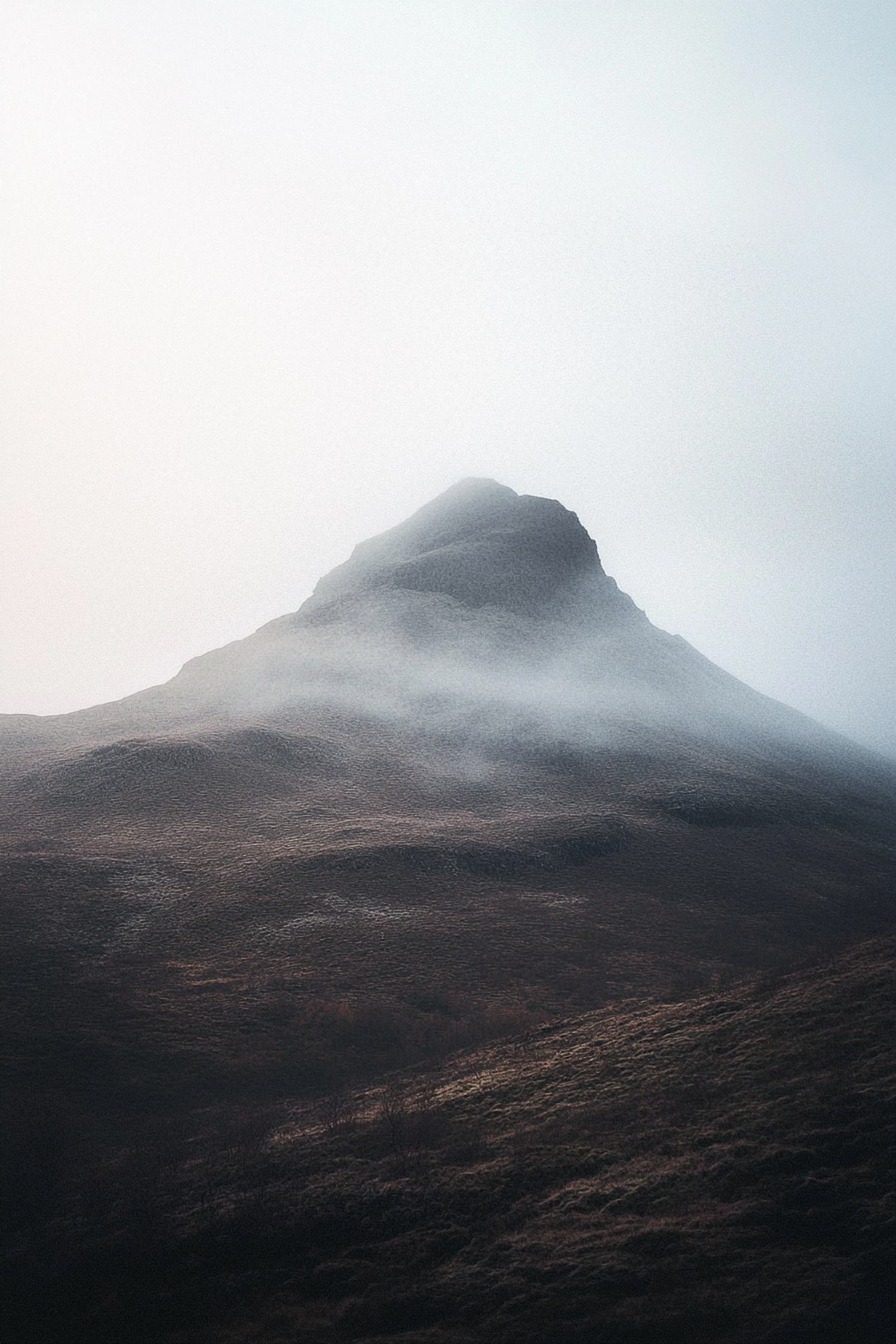 Misty mountain peak with foggy slopes and rolling hills, creating a serene and ethereal landscape.