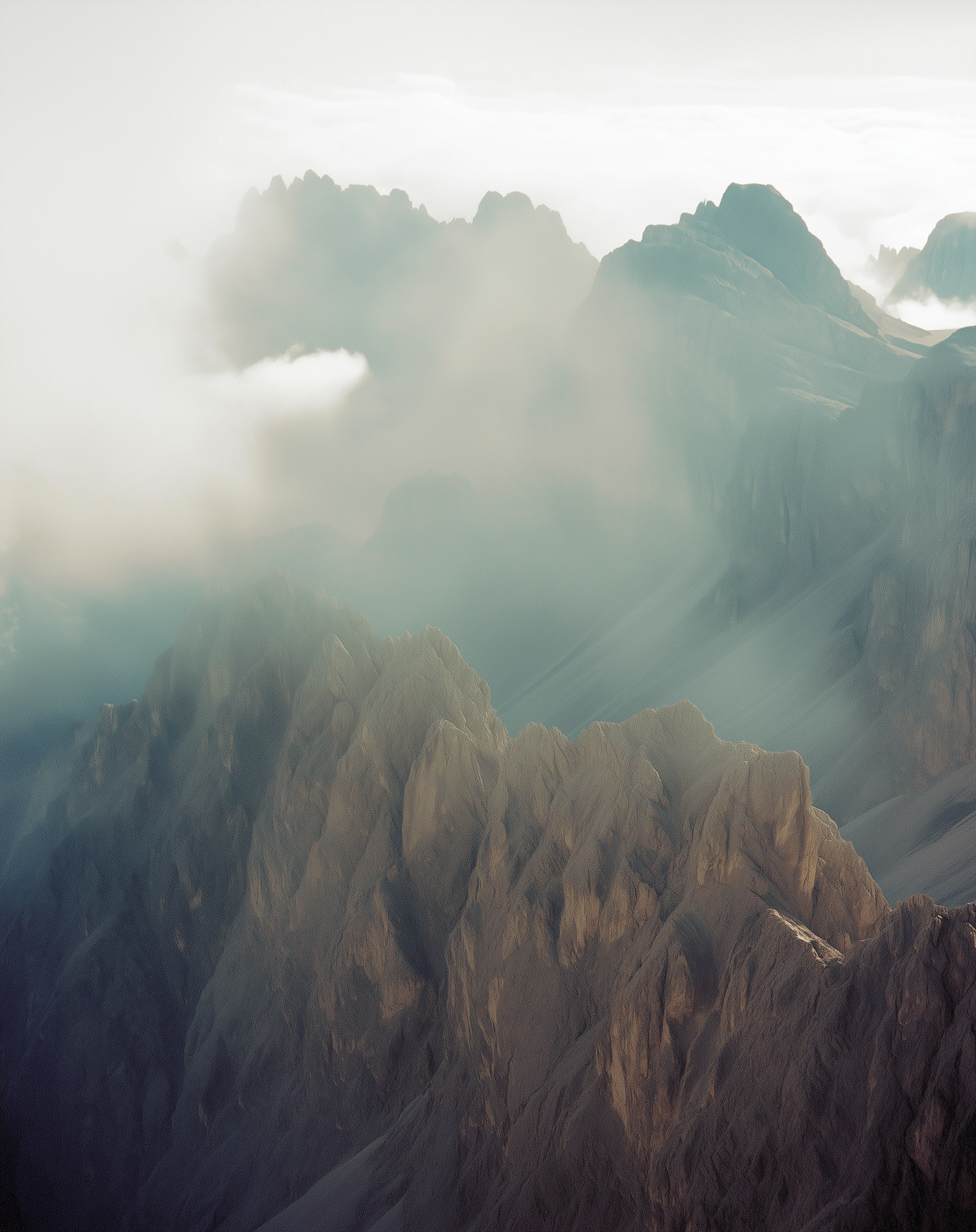 A tranquil mountain scene with rugged peaks and soft mist, creating a serene and ethereal atmosphere with muted tones and diffused light.