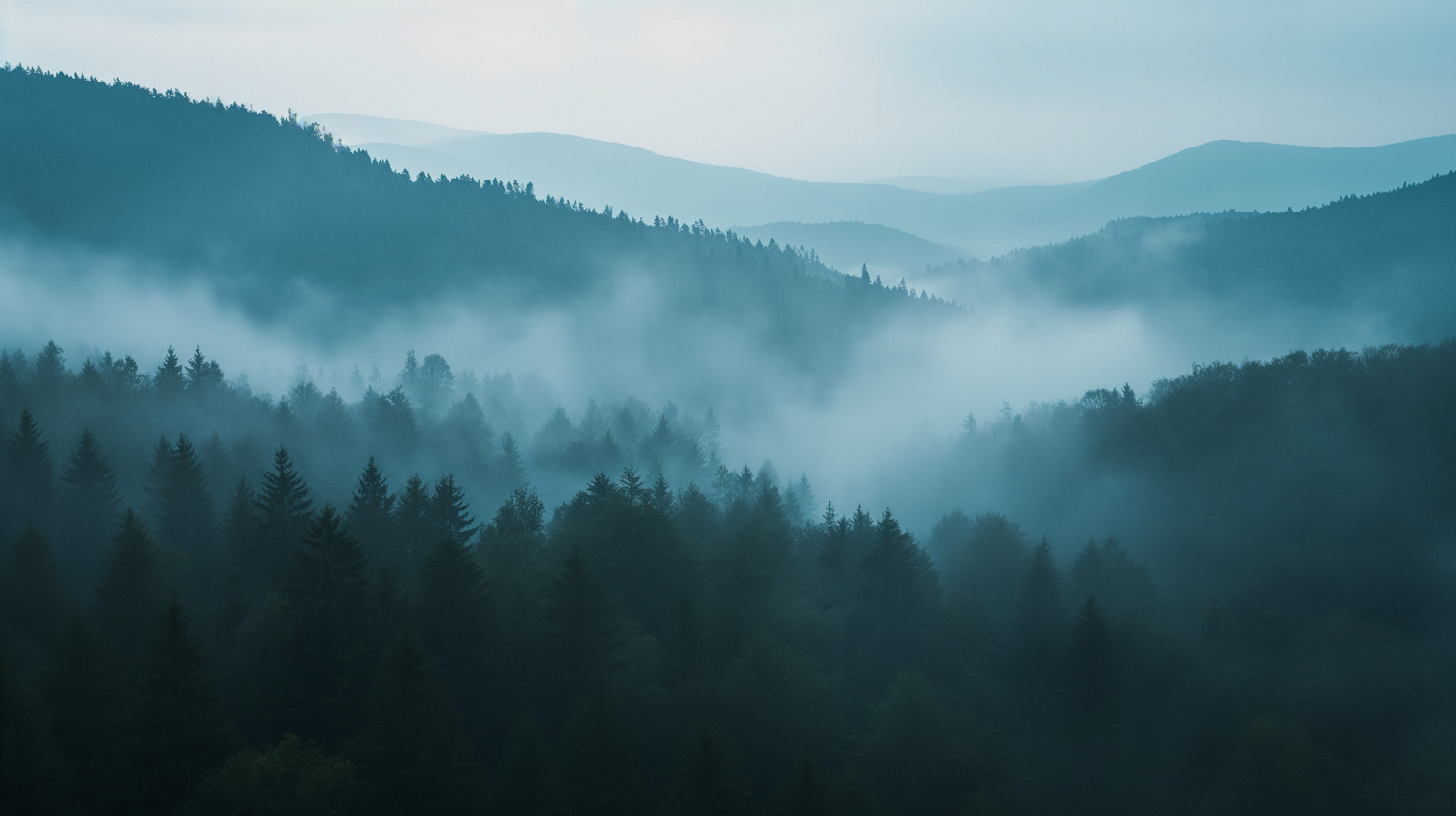 Misty forest landscape with dense coniferous trees and rolling hills, creating a serene and mystical atmosphere.