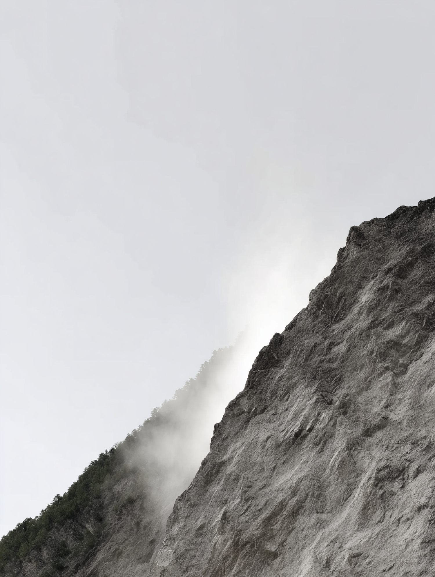 A rugged mountain slope with mist rising from its base, partially obscuring a forested area, under an overcast sky.