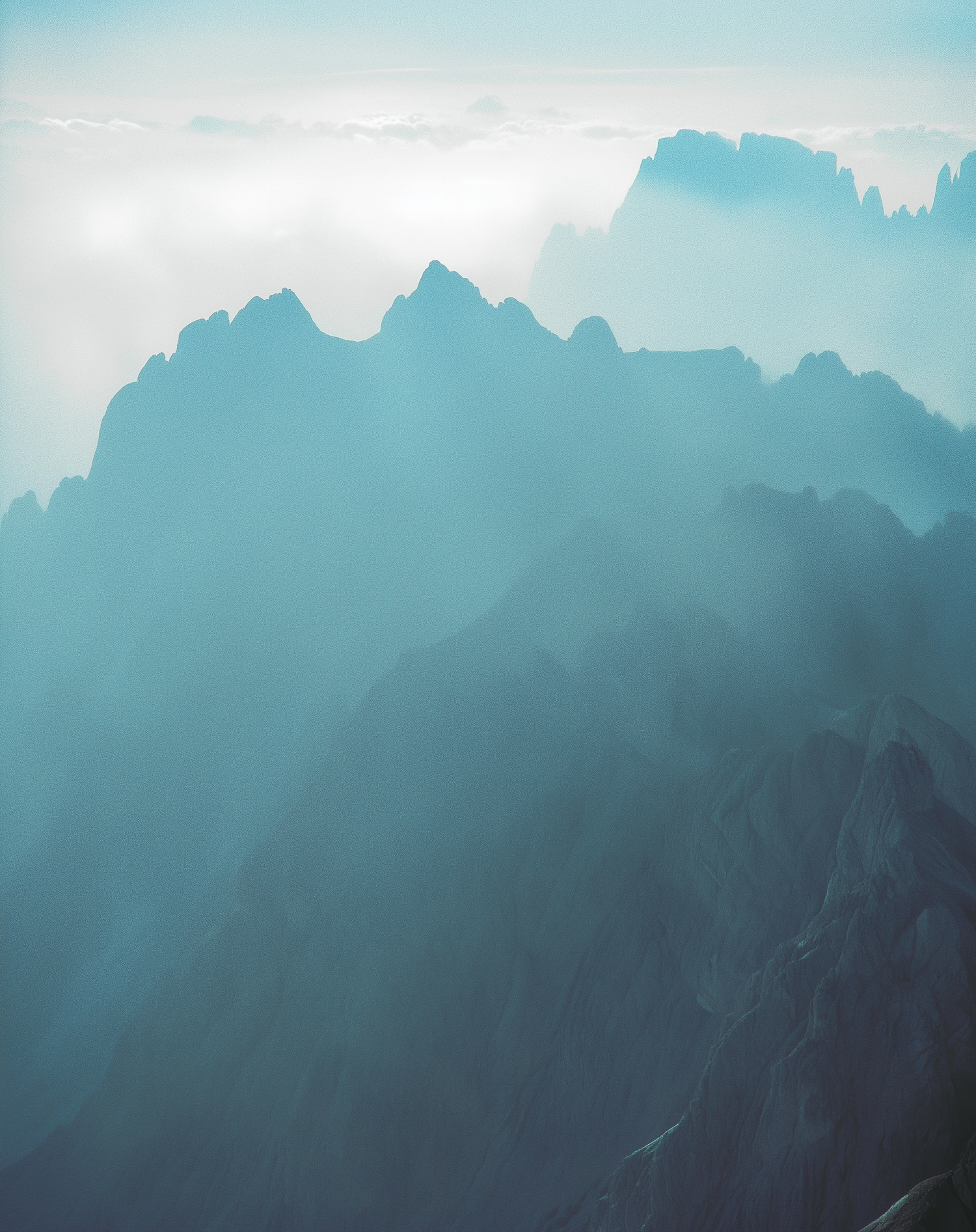A tranquil mountain scene with misty blue hues, rugged peaks, and a serene atmosphere blending into the horizon.