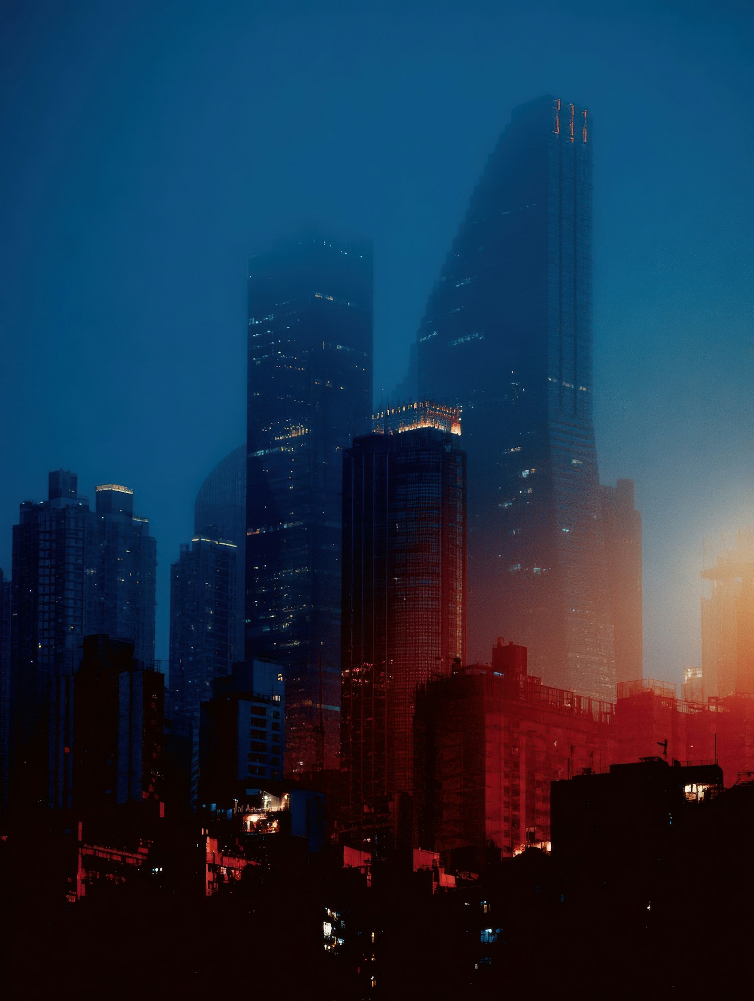 Moody cityscape at night with skyscrapers in blue and red lighting, creating a cinematic and futuristic urban atmosphere.