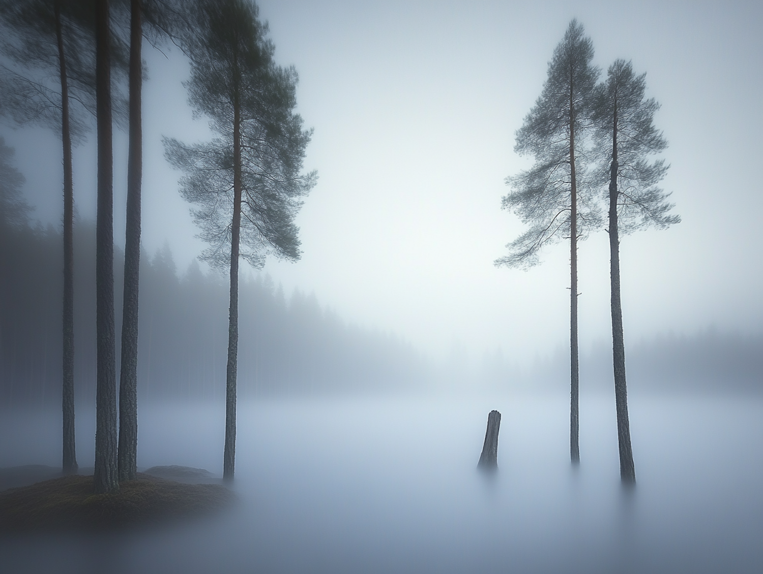 Misty forest scene with tall pine trees and a foggy, ethereal atmosphere. Perfect for nature lovers and serene landscape enthusiasts.