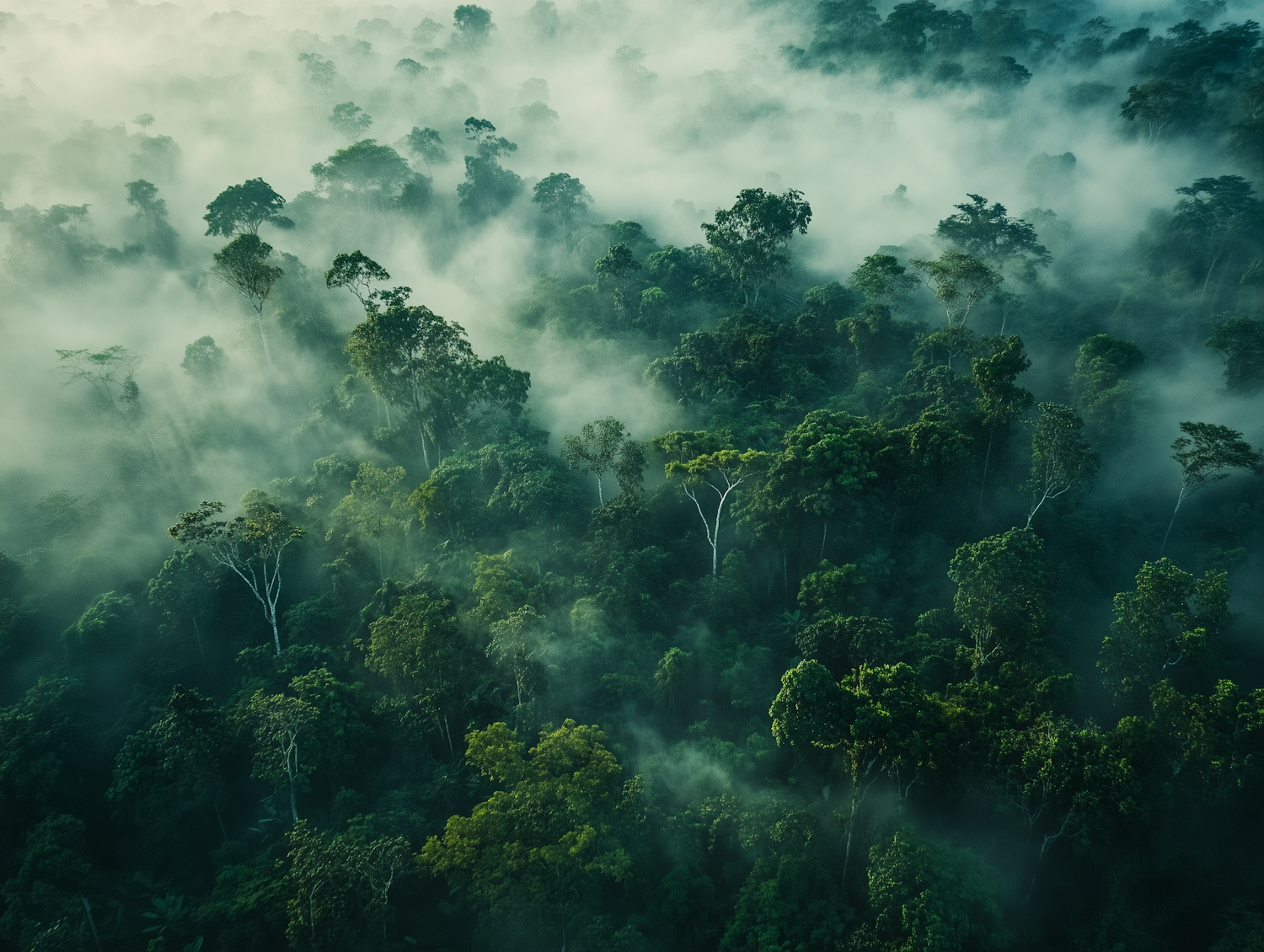 Aerial view of a misty rainforest with lush green trees and a mystical atmosphere, stretching endlessly into the horizon.