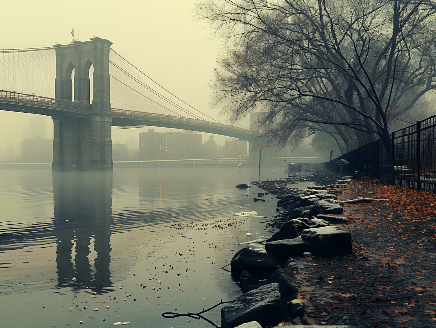 Misty river scene with a bridge, bare trees, and scattered leaves. A tranquil, foggy atmosphere with muted colors and reflections.
