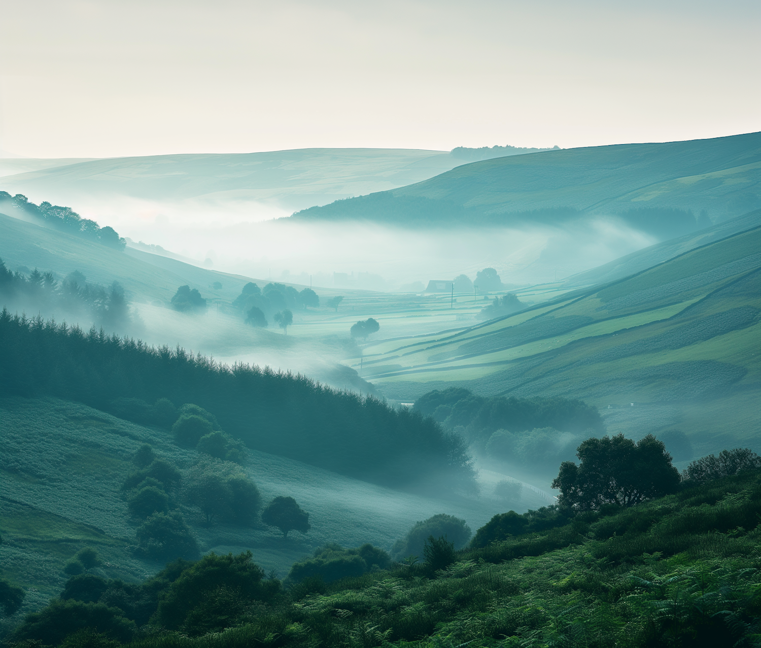 Serene landscape of rolling green hills and misty valleys, creating a tranquil and ethereal atmosphere.