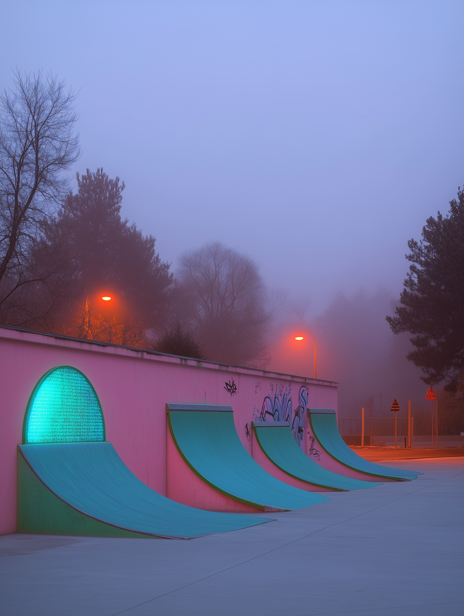 Misty skate park with teal ramps and pink walls, glowing turquoise light, and orange streetlights creating a serene atmosphere.