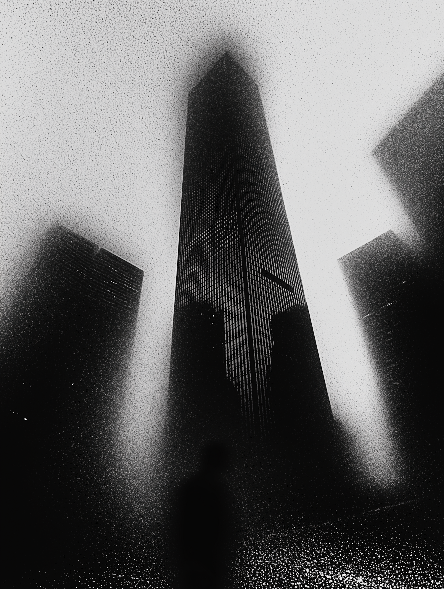 A dramatic black and white cityscape with a towering skyscraper shrouded in mist, creating a mysterious and ethereal atmosphere.