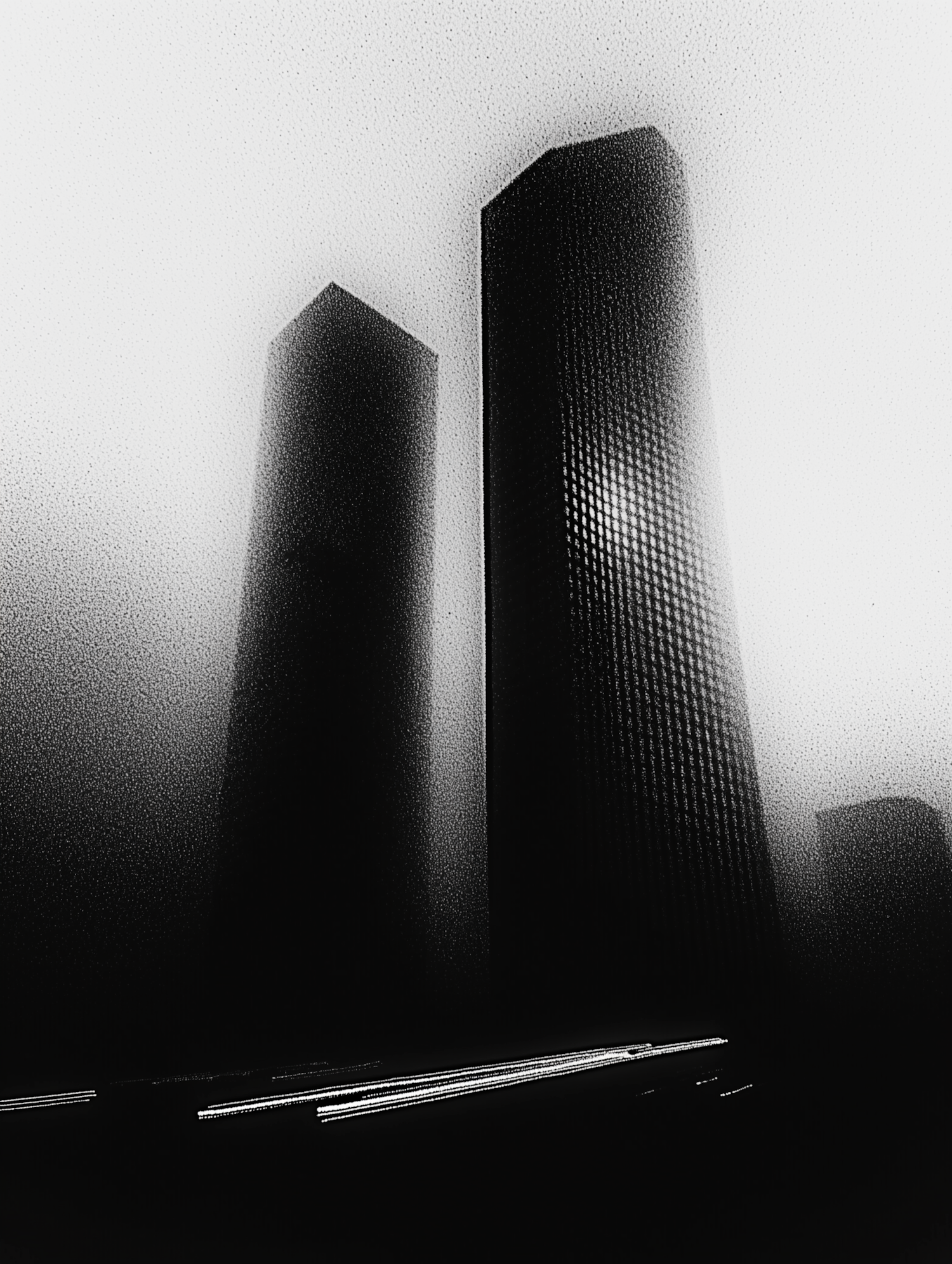 Monochromatic skyscrapers in misty haze, high-contrast black and white, with grid-like windows and dramatic atmosphere.