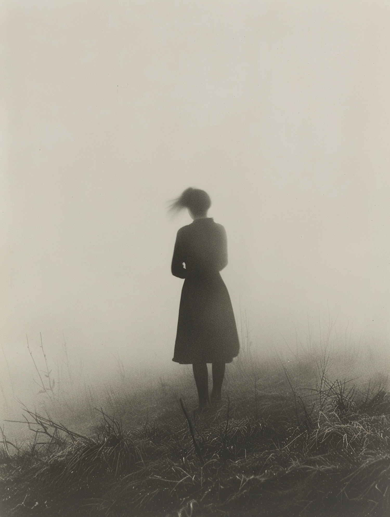 A solitary figure in a foggy landscape, creating a mysterious and ethereal atmosphere with soft contrasts and a sense of isolation.