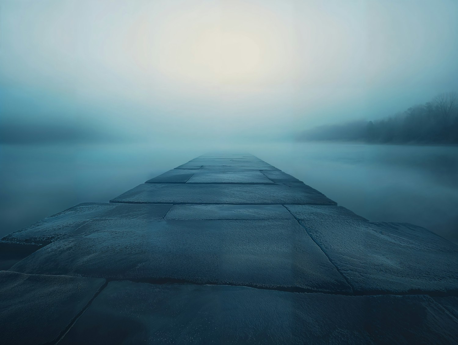 A misty stone pier stretches into calm waters, blending with a foggy horizon. Cool blue tones create a serene and mysterious atmosphere.