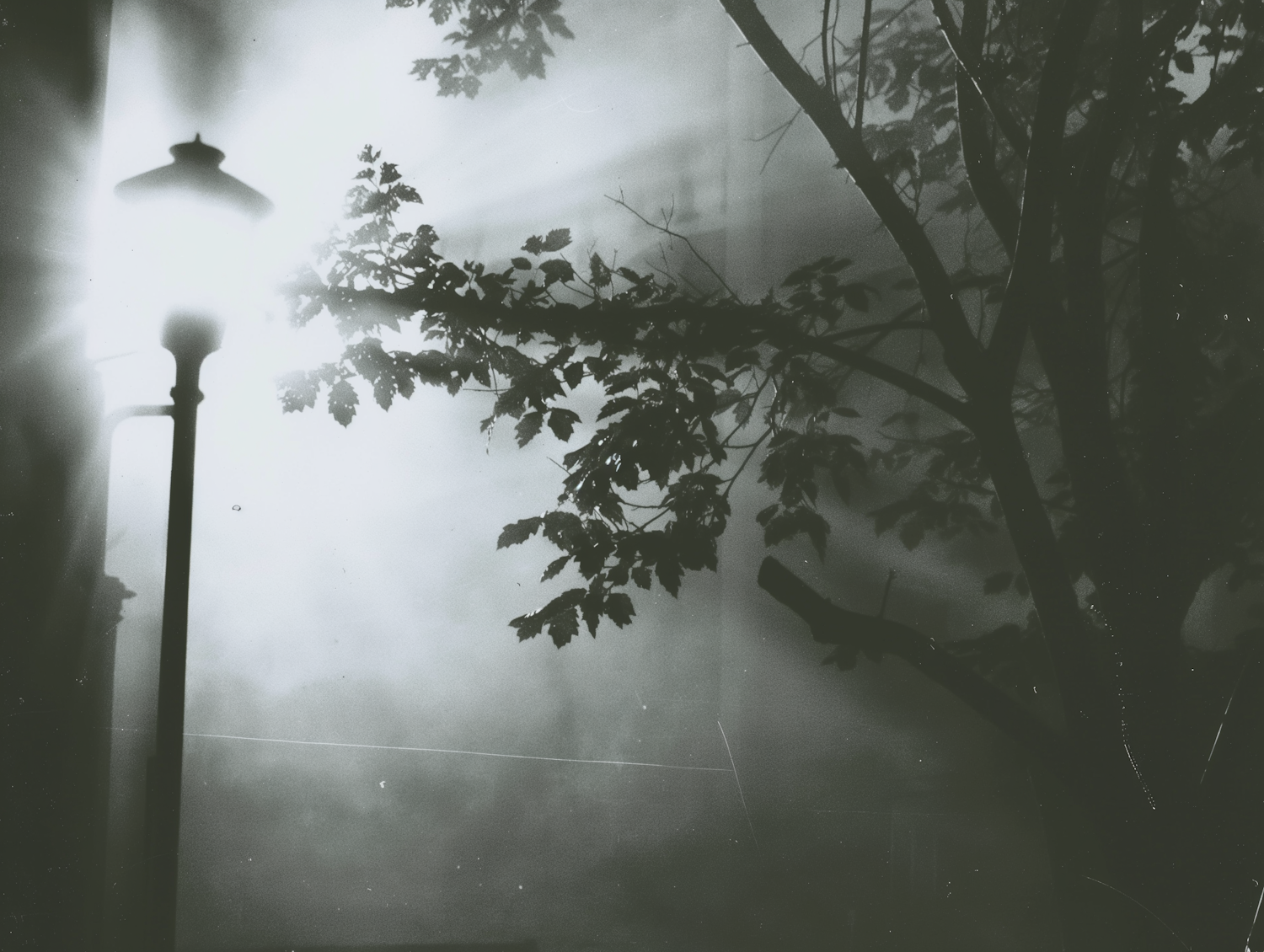 Misty black and white scene with a vintage street lamp and tree, creating a serene and mysterious atmosphere.