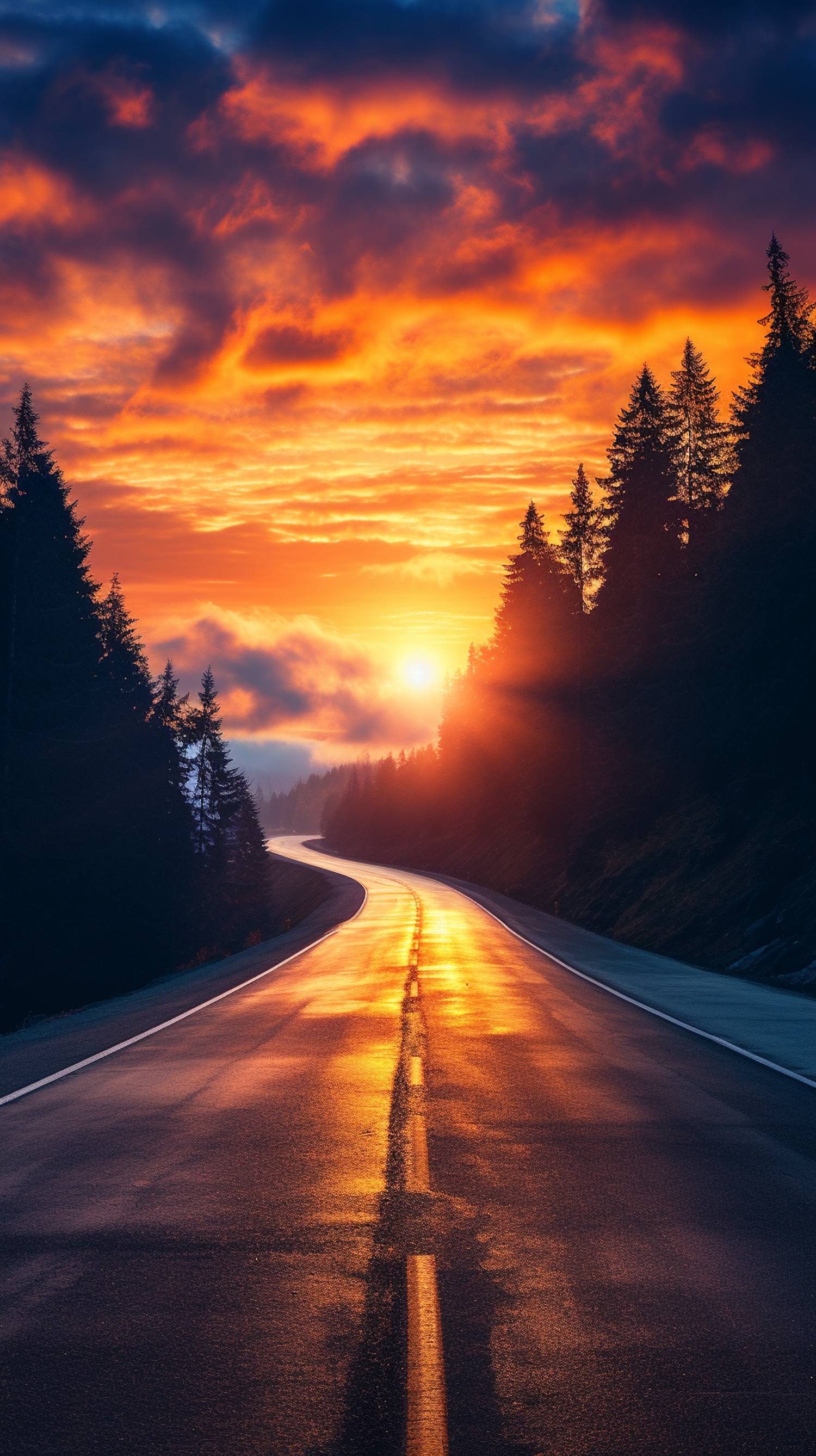 A winding road reflects a fiery sunset with vibrant orange and gold hues, surrounded by tall evergreen trees and dramatic clouds.