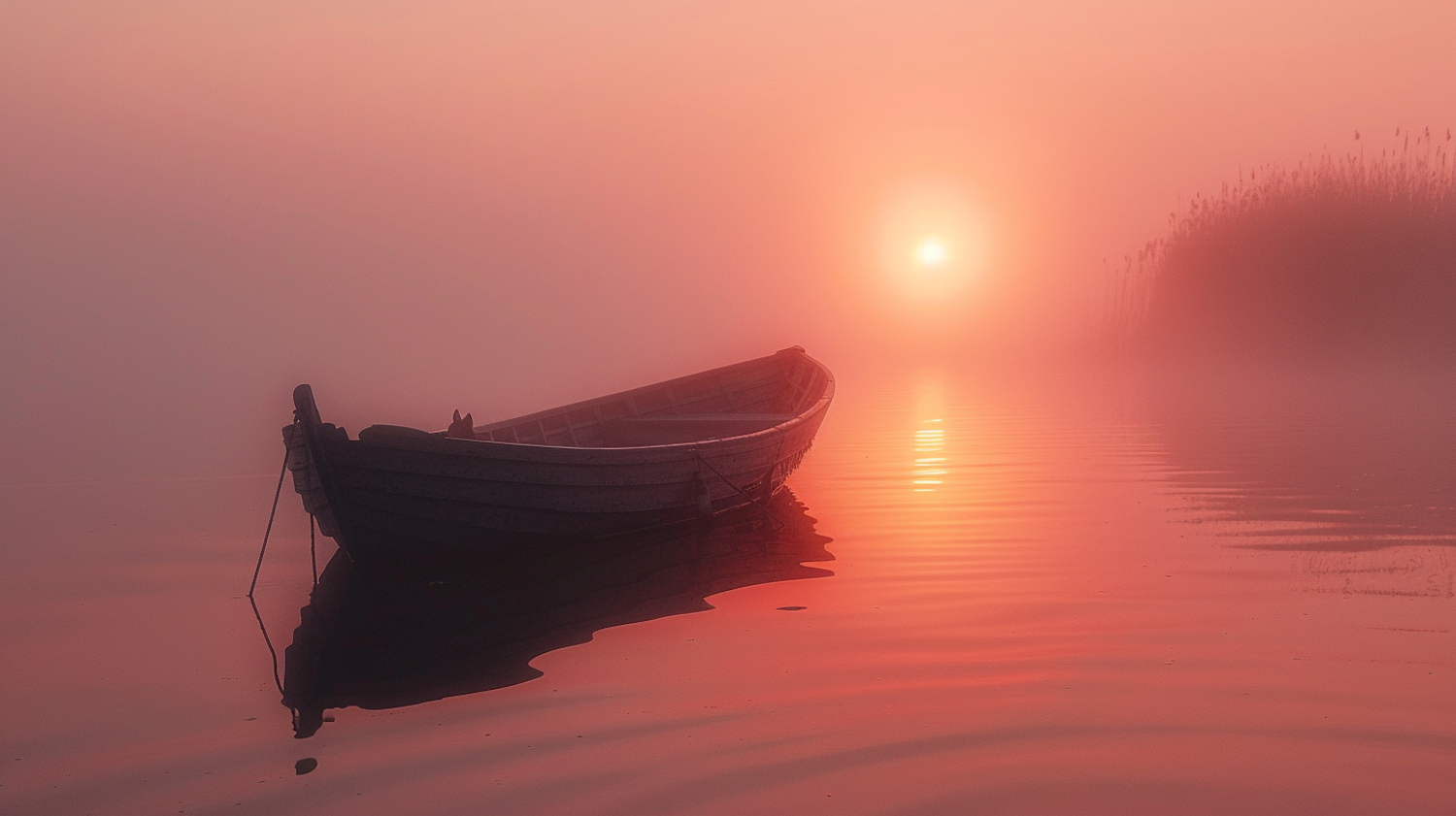 Serene boat on a misty lake at sunrise or sunset, with warm pink-orange hues and tranquil reflections.