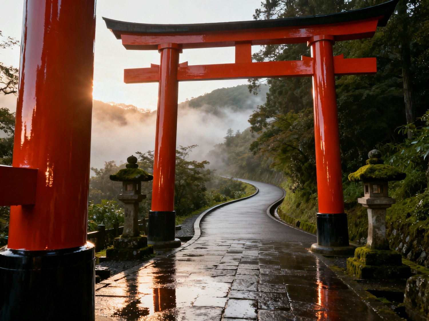 A vibrant red torii gate in a misty forest, with a wet stone path and moss-covered lanterns, creating a serene and tranquil atmosphere.