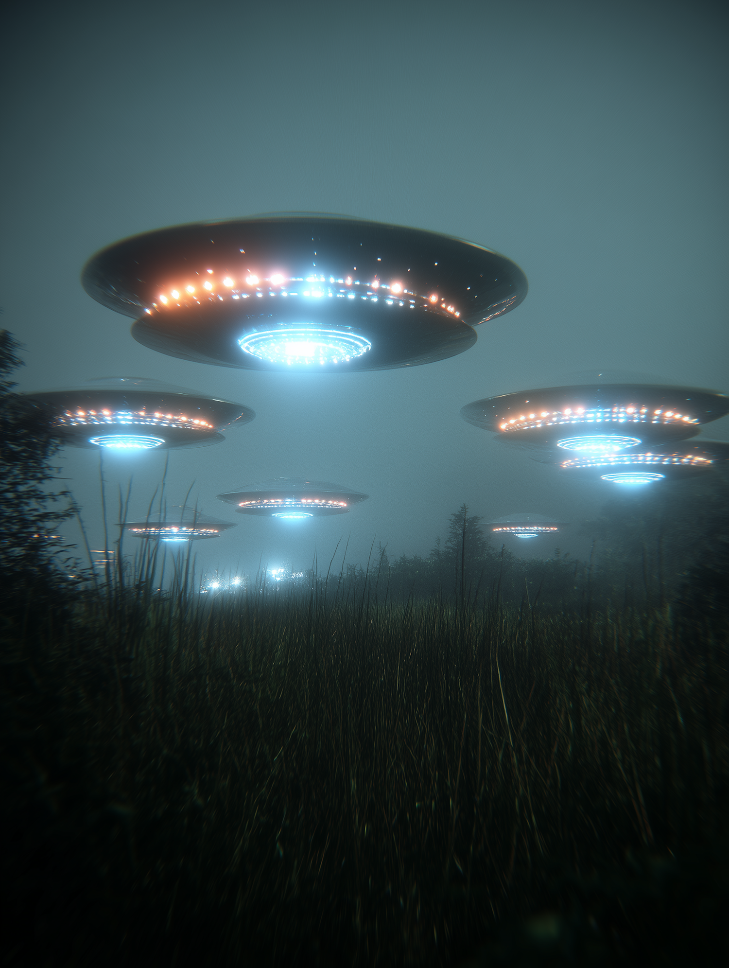 A misty field with glowing UFOs hovering above, their lights illuminating the foggy surroundings, creating a mysterious and surreal atmosphere.