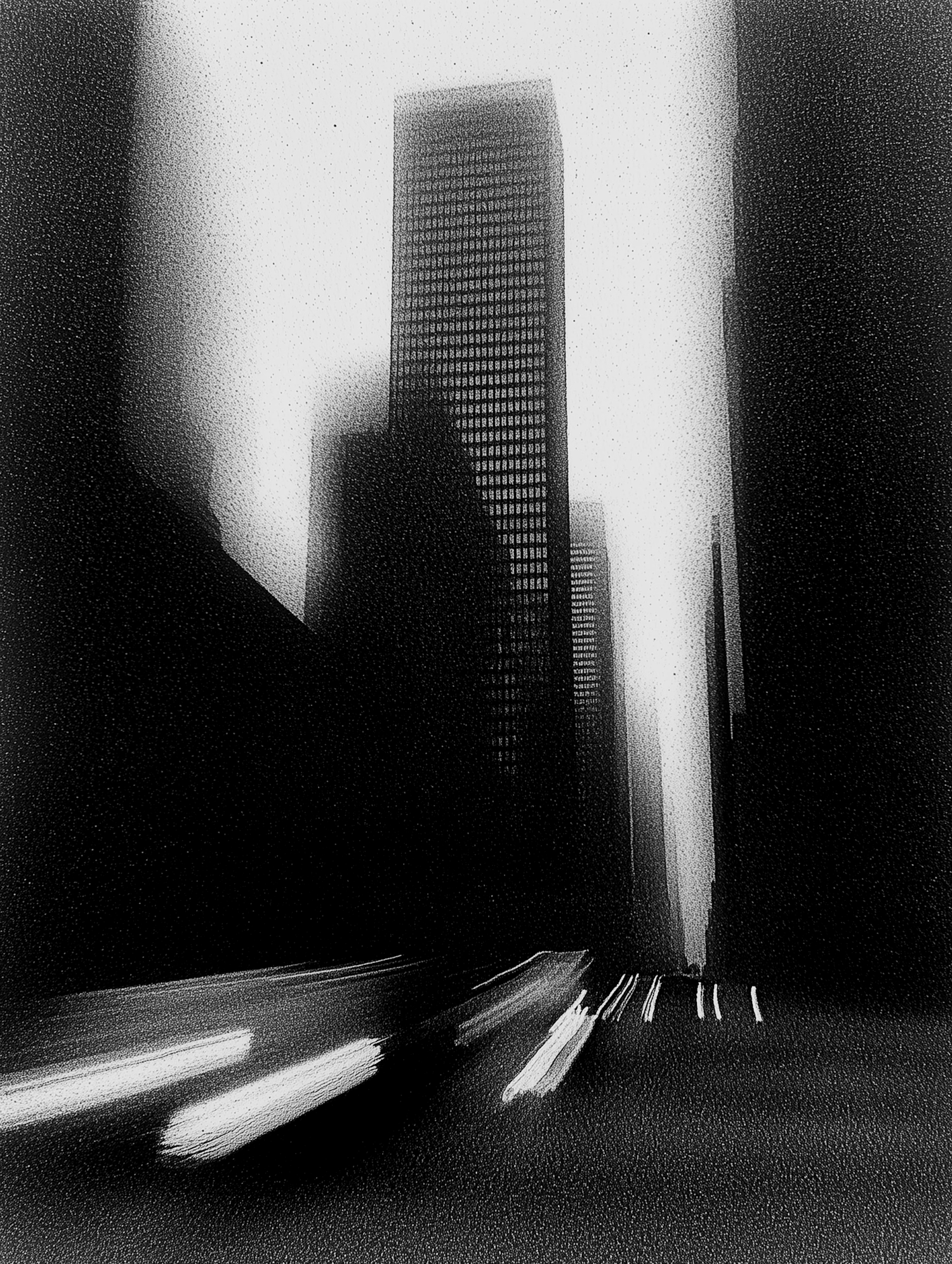 Monochrome cityscape with towering skyscrapers and dynamic light streaks, creating a mysterious urban atmosphere.