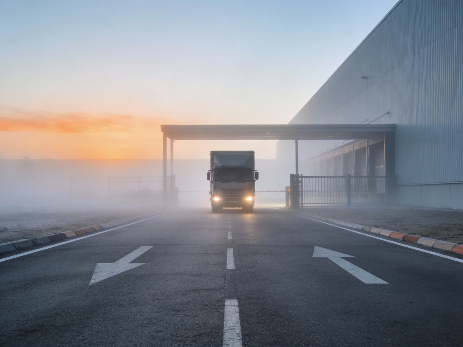 A truck approaches a warehouse in a misty morning setting, with glowing headlights and a serene gradient sky in the background.